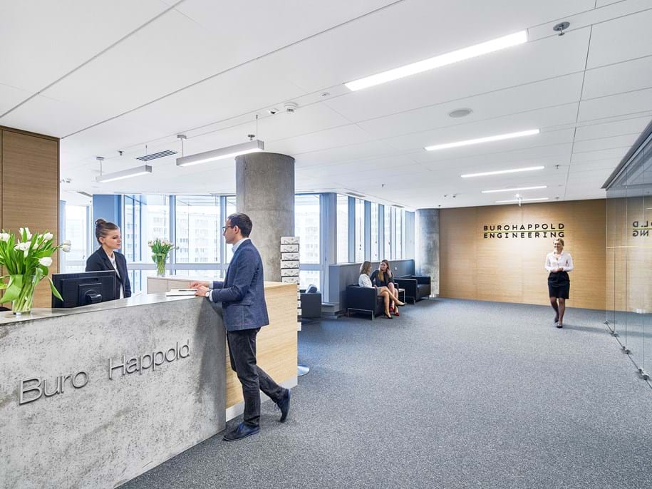 BuroHappold’s new, healthy office is located in the central business district of Warsaw, Poland, in a freshly renovated high-rise building. As you arrive on the sixth floor, through glass doors, you can see a welcoming, spacious reception area. The first thing that strikes you is how peaceful it is despite the open space with 120 people at work. There is just a soft, pleasant background noise. In conference rooms voices are crystal clear, but inaudible when you leave them. If you want to make a phone or a video call you can go to a ‘phone booth’. Your conversation will be perceived as perfectly neutral, without the impression of speaking from a confined space or disturbing others. For privacy or concentration, there are quiet rooms that let you work in absolute silence.