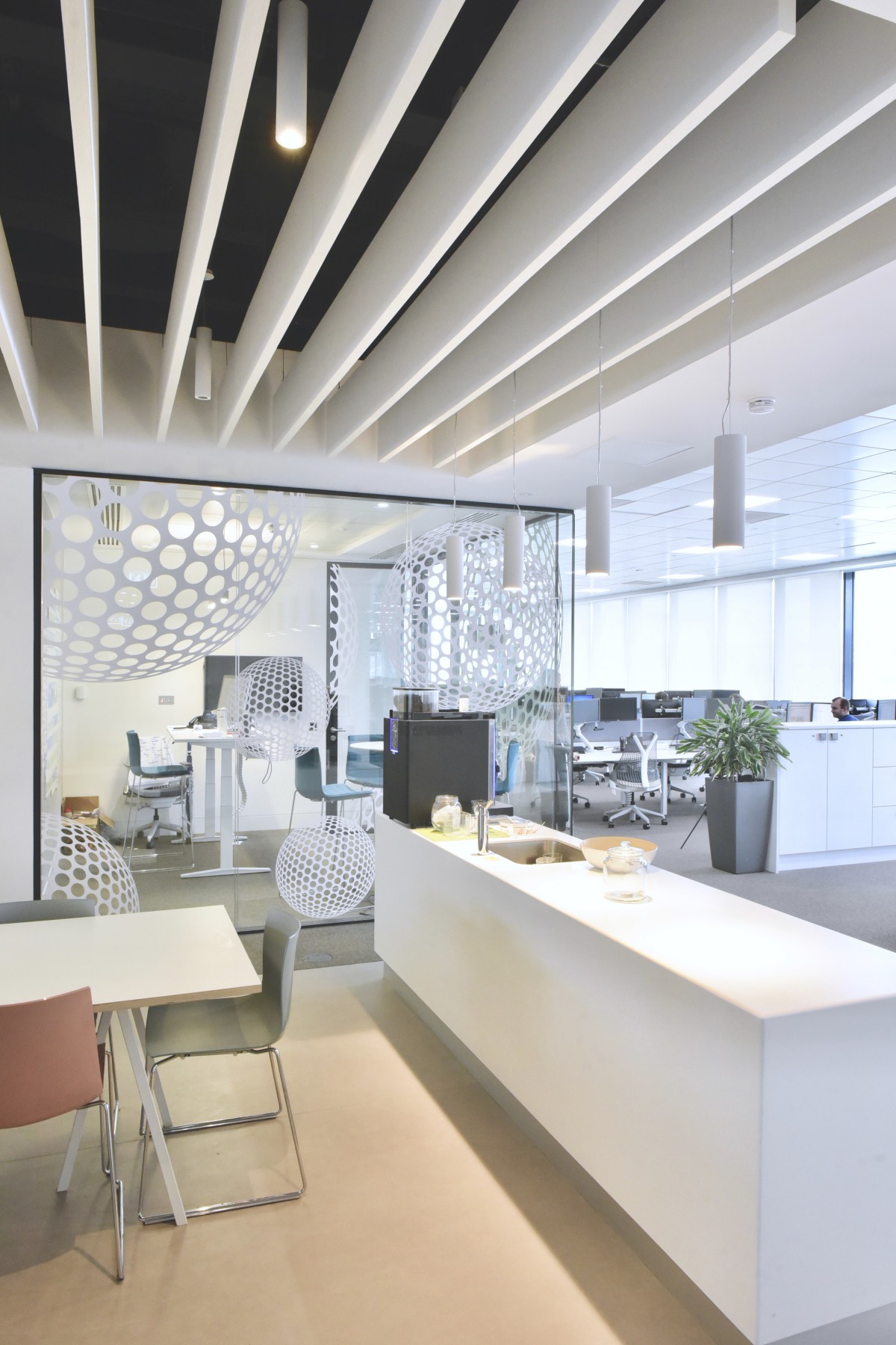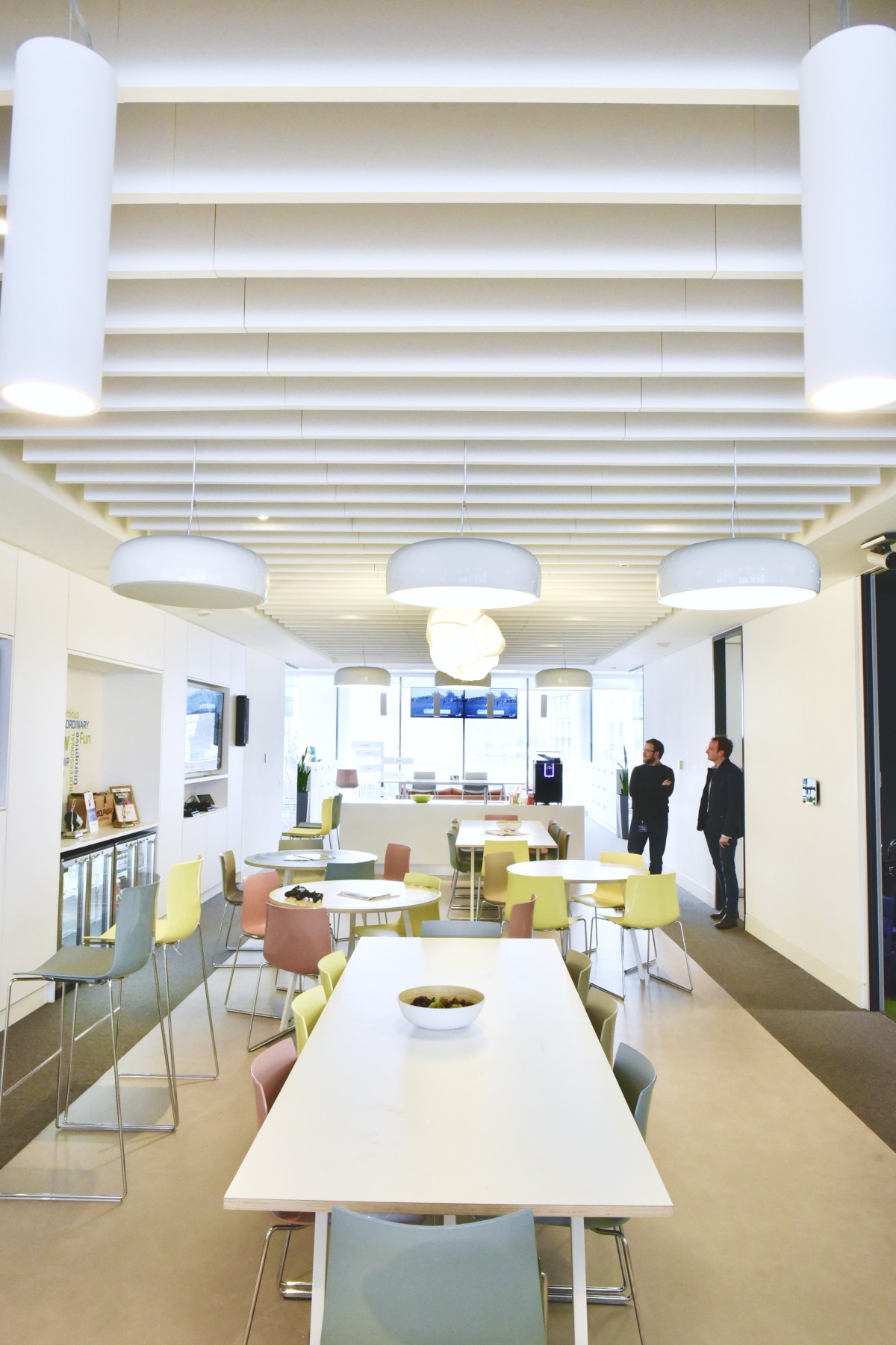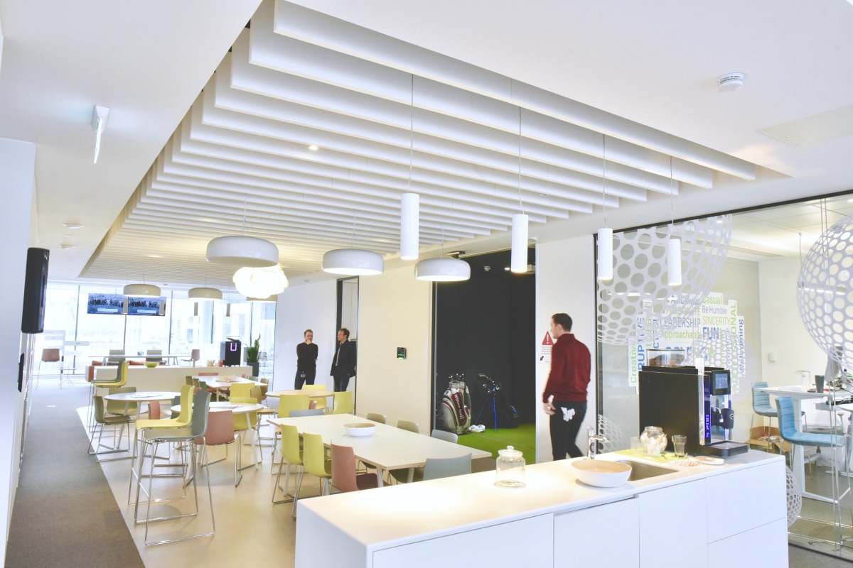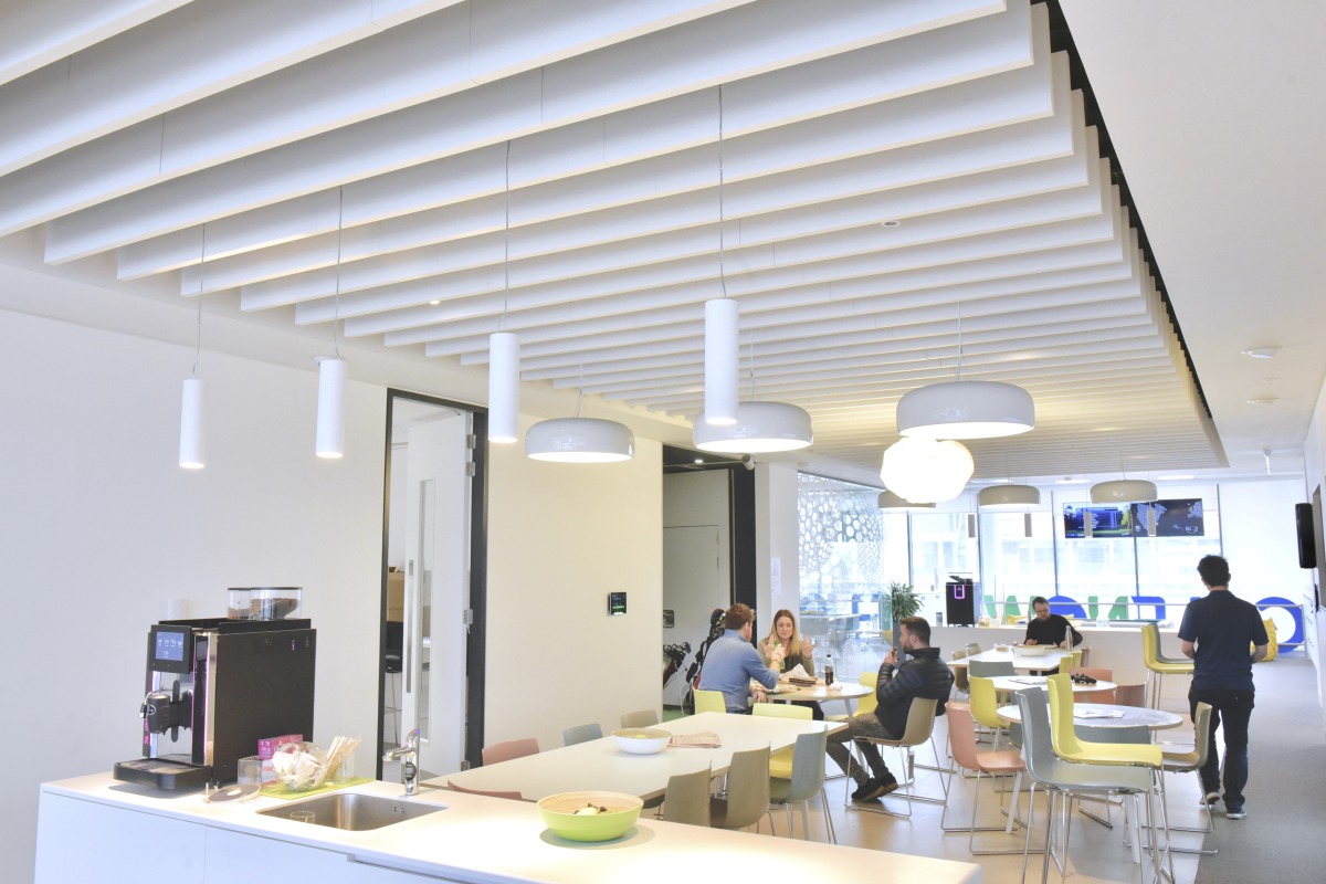 He explained that Solo Baffles were utilised in the board room, meeting rooms, breakout spaces, and cafeteria/kitchen areas in order to assist with acoustic quality. “They are a nice, simple, aesthetically pleasing product, allowing easy access to building services above. They have worked well in practice assisting with acoustics in a busy open plan working environment.”
