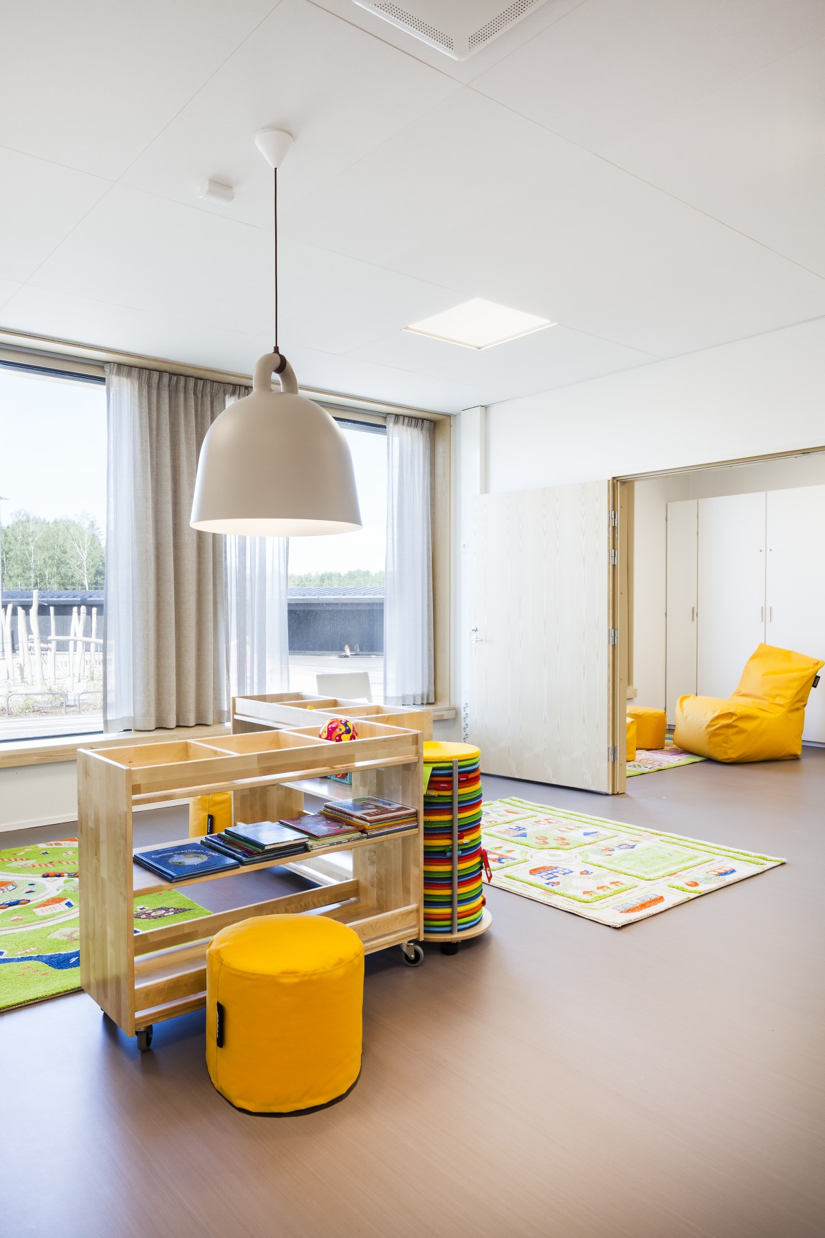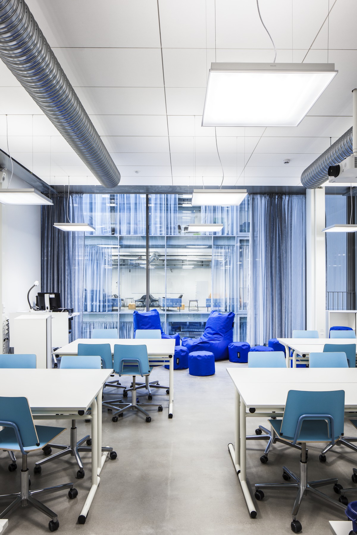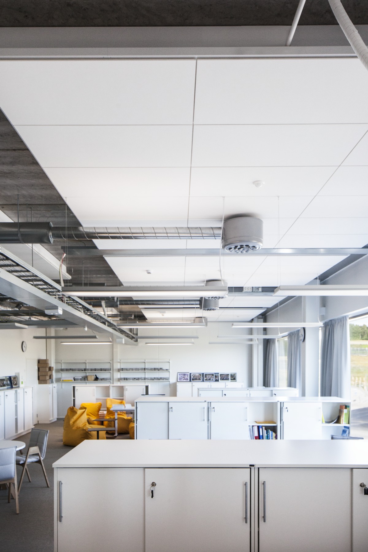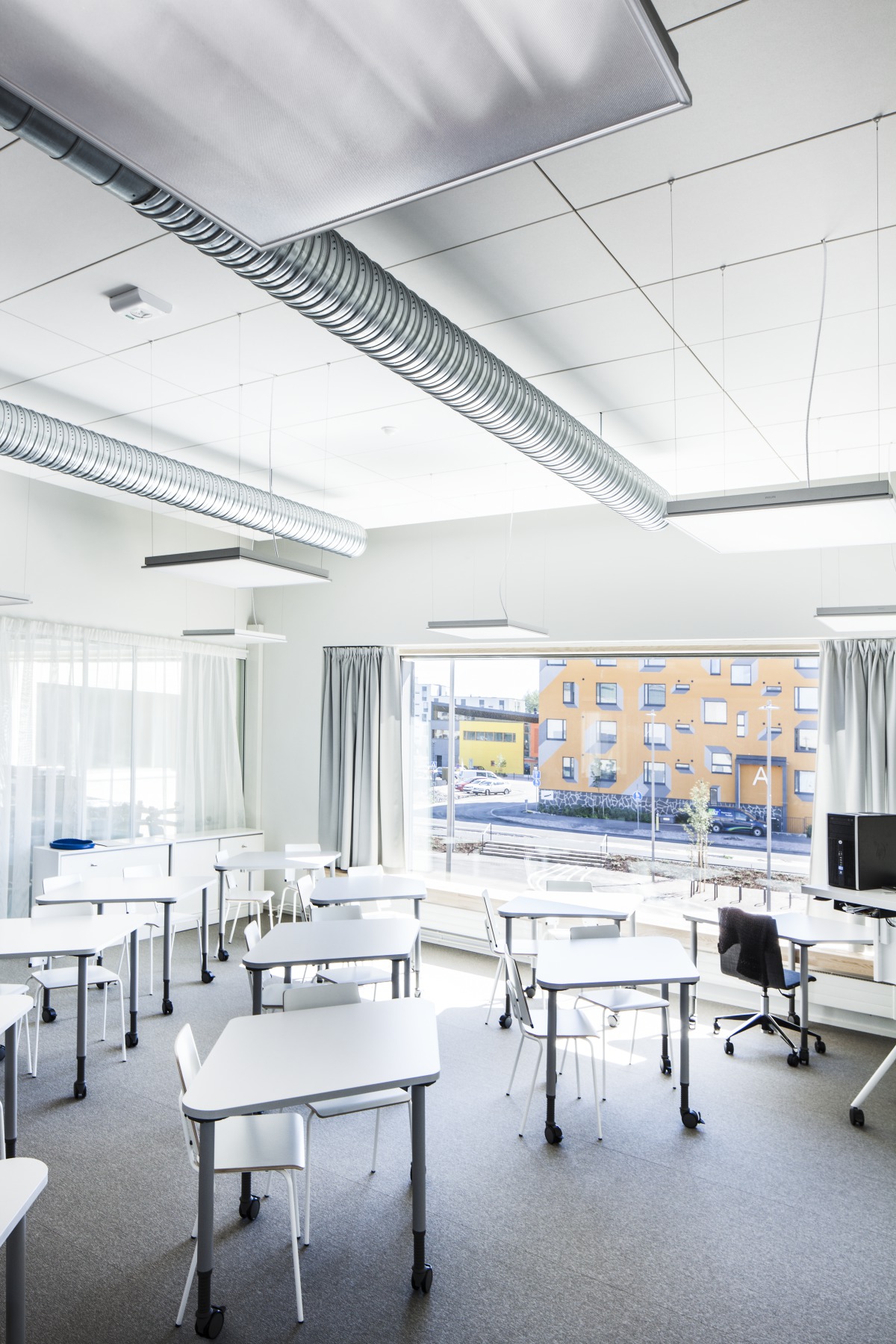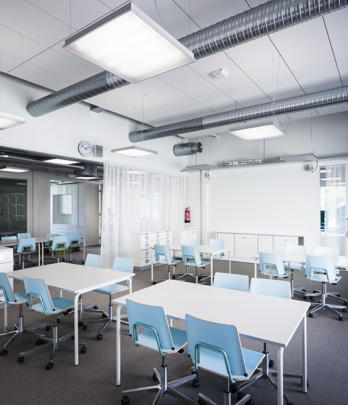 This solution did not work at Opinmäki because, in the novel educational spaces, the teacher’s position and direction of speech are no longer as clear. The classrooms were designed to function in all directions by adding enough sound-absorbing acoustic materials all over the ceilings.