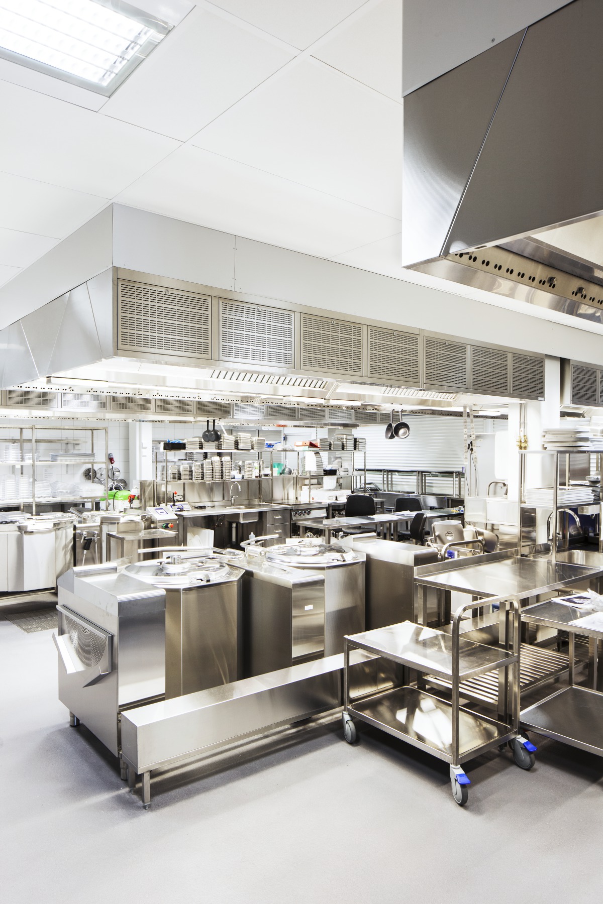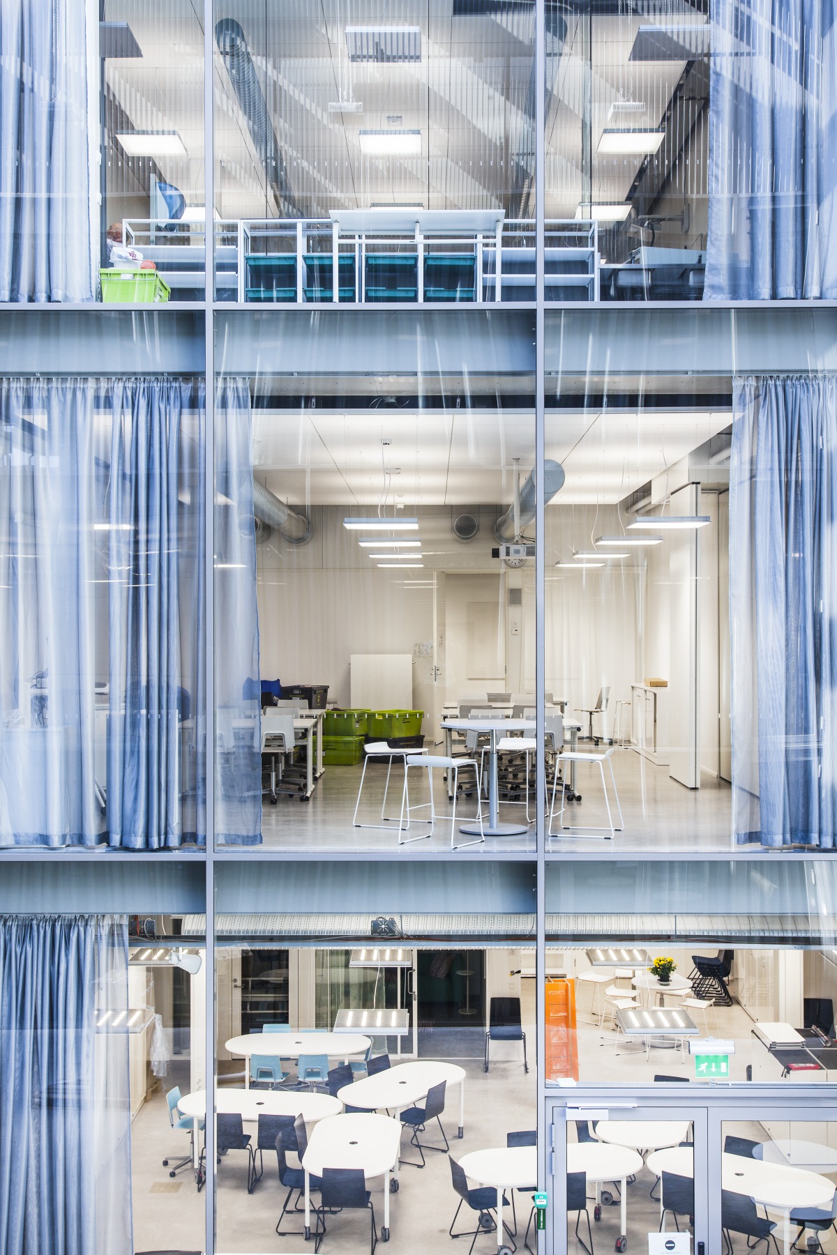 The large entrance hall is a multifaceted and asymmetrical space with many hard surfaces, connecting the various activities taking place on the campus. To prevent the unpleasant noise of sound bouncing off structures, the walls in the space have been placed at different angles. The ceiling in the entrance hall is made of wire mesh, and wool panels have been installed above the technology elements.