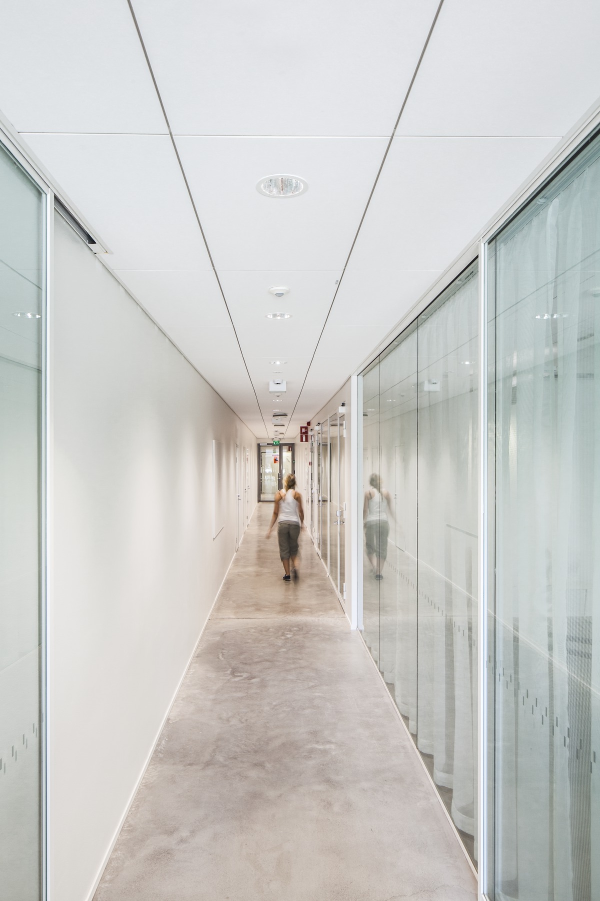 The hallway also has acoustic wall surfaces that have been finished with an acoustic plaster. This solution has further improved the absorption of sound in the unconventional space.