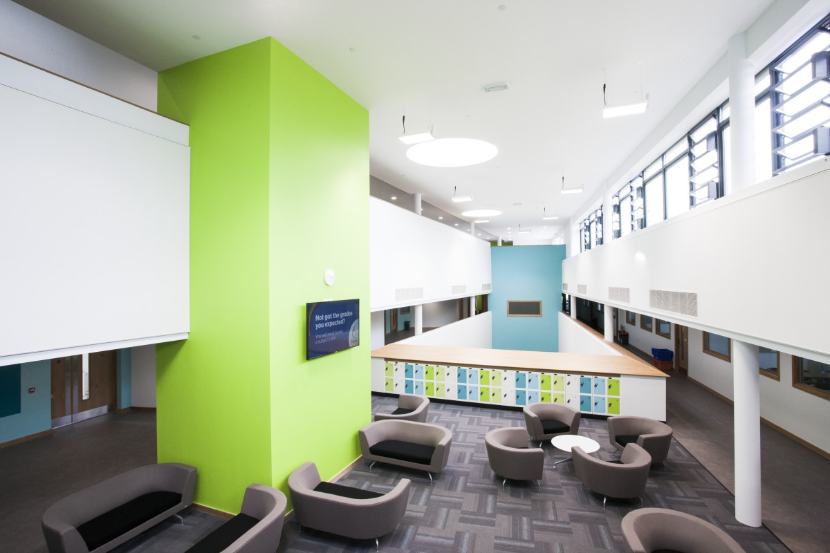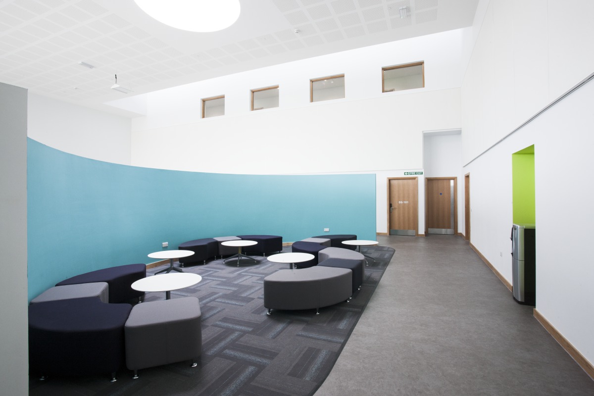 Large open atriums, combined with breakout and flexible teaching spaces, present reverberation challenges that must be addressed early on in the planning stage. The college was a new build and Ecophon was brought in at the design stage to propose acoustic solutions for this three-storey development.
