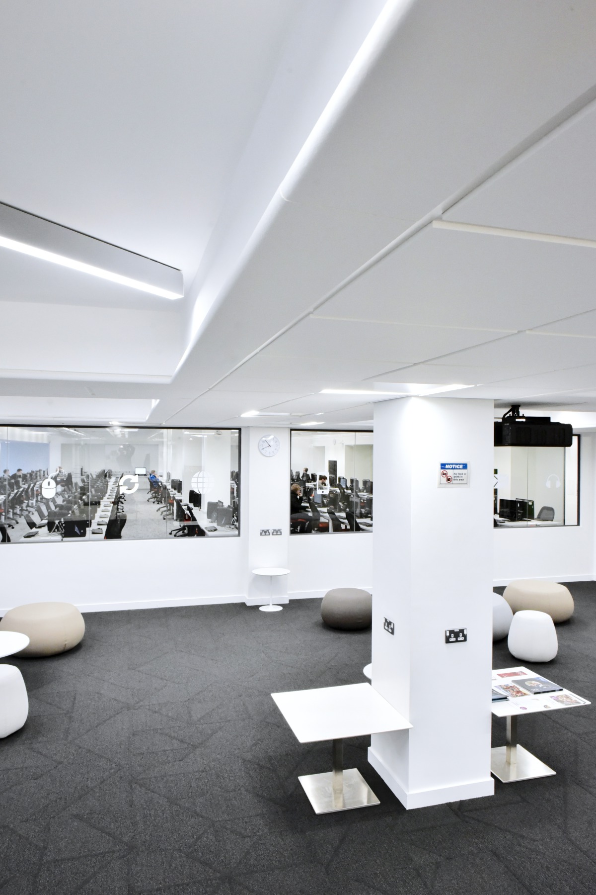With a recessed visible grid and a tegular edge design, this has created a ceiling with a shadow effect that accentuates each tile and partially conceals the grid system. Ecophon Focus Wing is an edging system for suspended ceiling rafts, normally installed at the perimeter. The system has been used as an edge feature where the suspended ceiling meets the feature lighting coffer, creating depth to enhance the look of the entrance area.