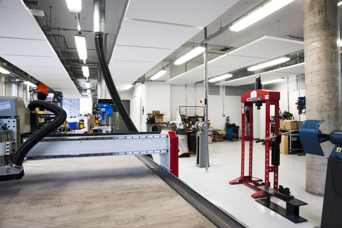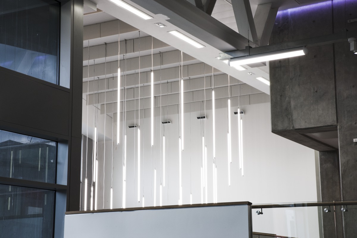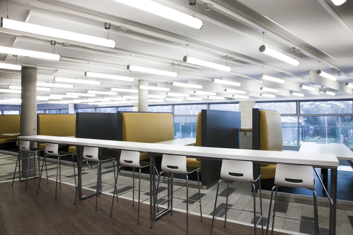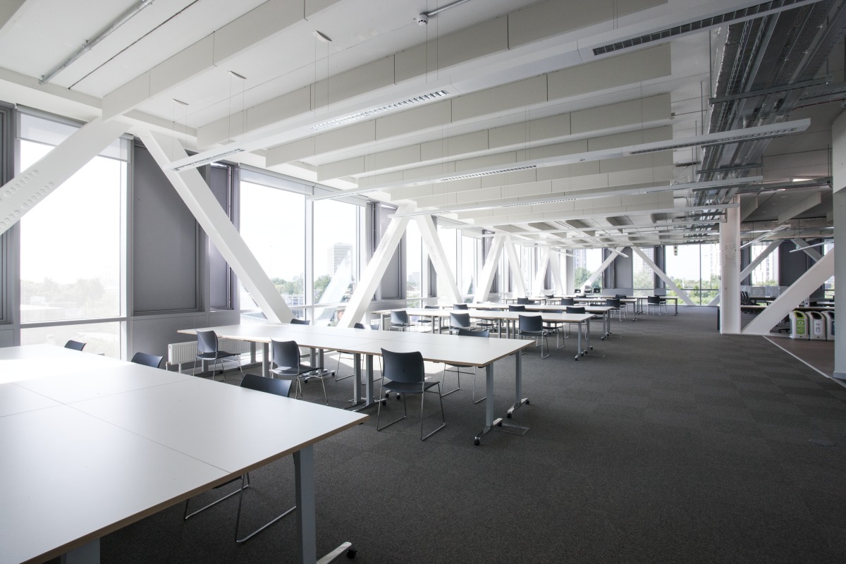 He described the main areas where Ecophon acoustic solutions were installed: “Ecophon have a well-designed family of products, which allow flexibility of design. Solo baffle was installed in the atrium and open plan teaching areas as part of a rhythm of lighting, acoustic baffles and service routes. Master F was used in the atrium and circulation areas, where clear head height and visibility was a priority. Solo Square helped us to create a ceiling plane allowing service distribution above.”