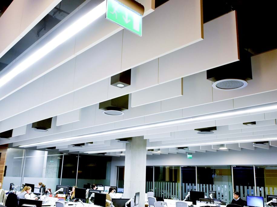 ’Acoustically the treatment clearly works. We have an open plan office, the news room is loud, there are people editing on open plan desks. Visually it was critical that when people walk into the building they get a sense of the modern look – that we’re a new broadcaster – and that they’d get the wow factor. The acoustic baffles definitely give us that.’