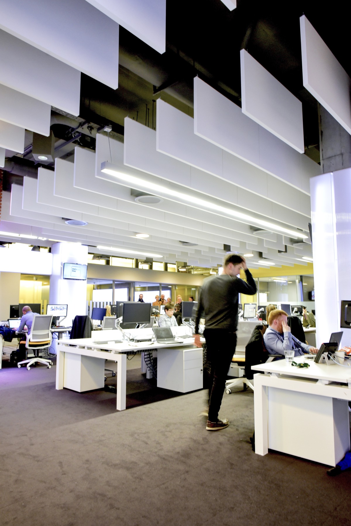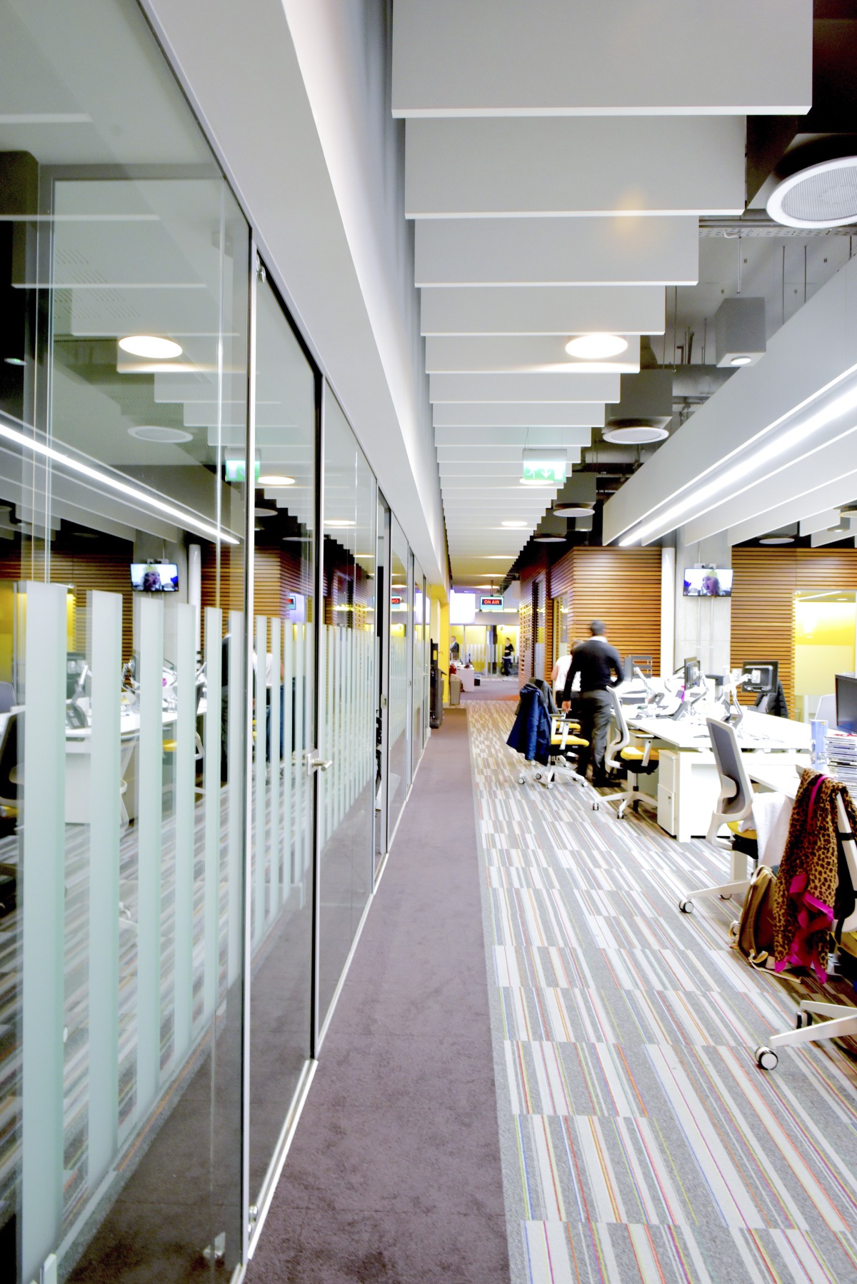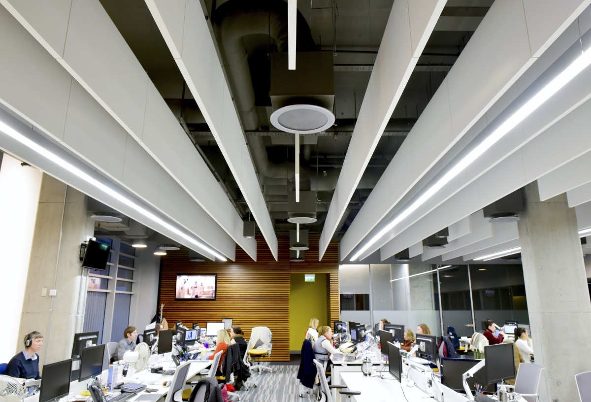 ’Acoustically the treatment clearly works. We have an open plan office, the news room is loud, there are people editing on open plan desks. Visually it was critical that when people walk into the building they get a sense of the modern look – that we’re a new broadcaster – and that they’d get the wow factor. The acoustic baffles definitely give us that.’