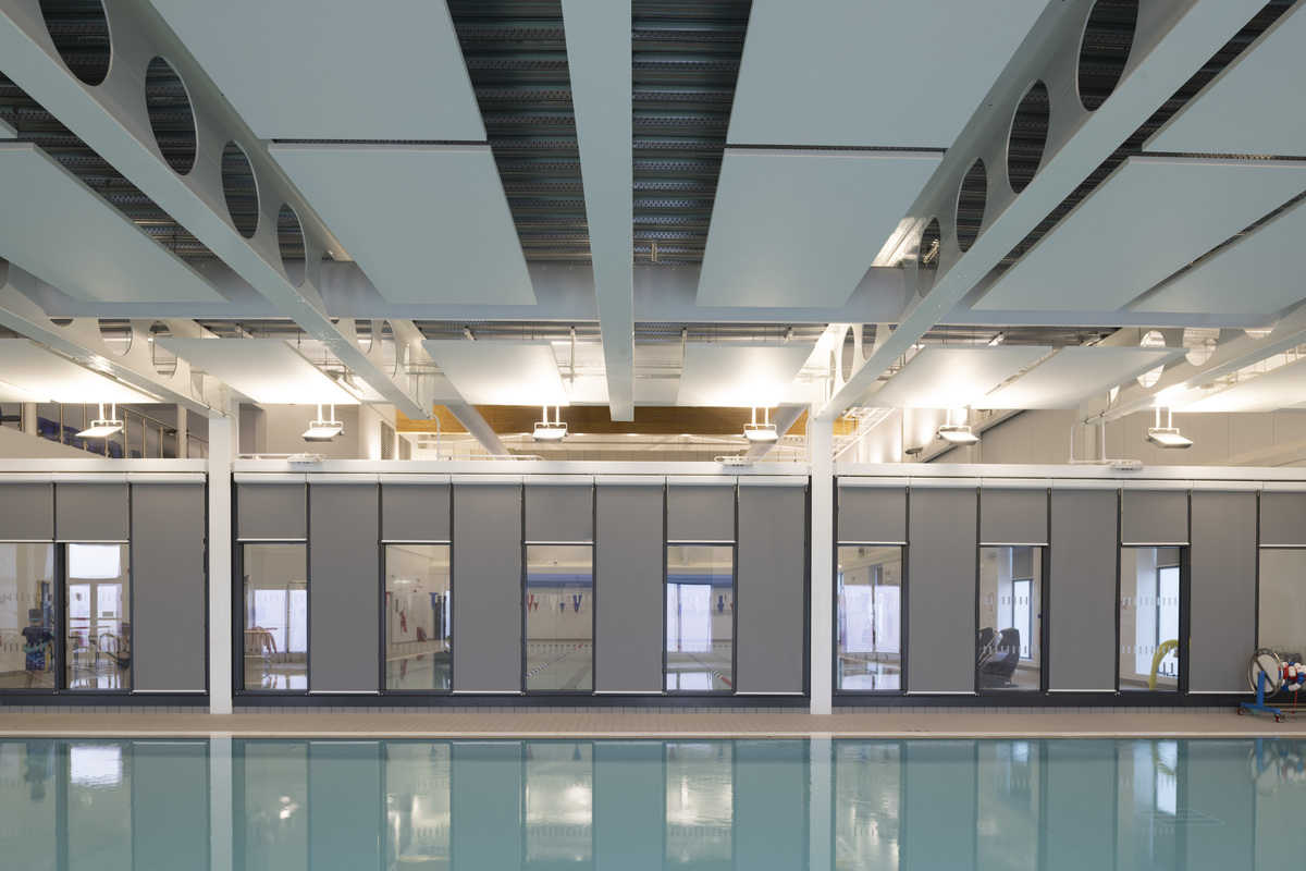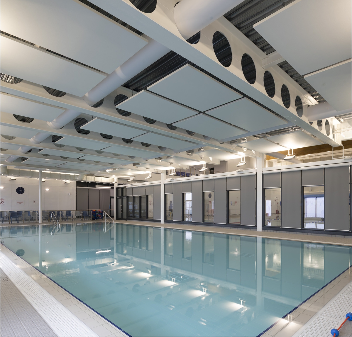 For the sports hall, which serves as the only Urban Cricket Hub in the North of England (funded by the English Cricket Board), we provided impact-resistant robust products, specifically Ecophon Akusto™ Wall C with Super G surface. In the swimming halls, where chlorine and humidity resistance were essential, we utilised C4 grid and fixings, along with Ecophon Solo™ Rectangle with Akutex™ HS finish.