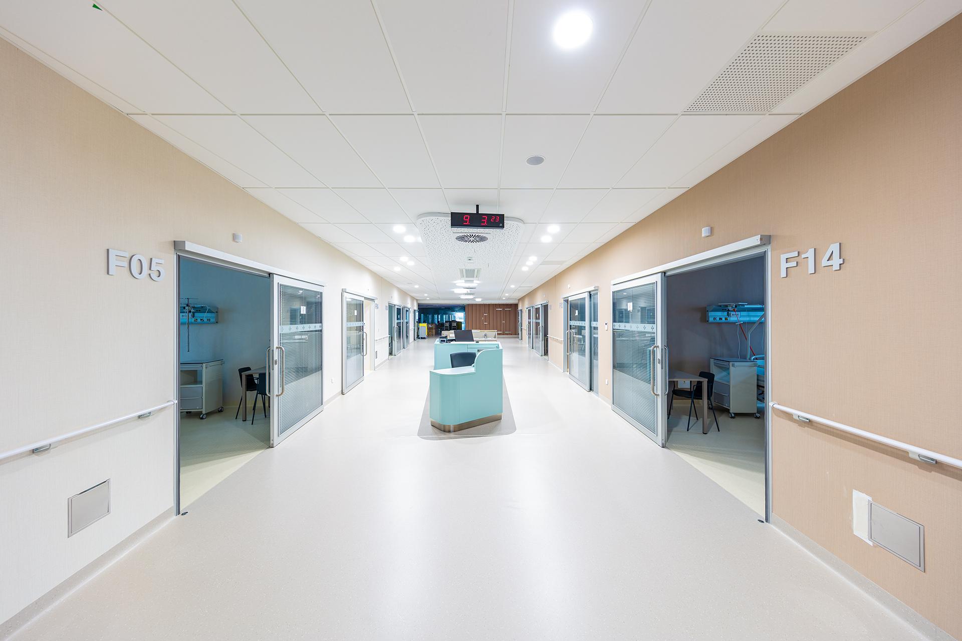 In addition to functionality, acoustic panels also have an aesthetic value. Design baffles give the space an unmistakable look. In addition to products from the Solo Baffle series, the hospital also used the products Advantage E, Focus E, Hygiene Clinic A, Hygiene Performance A, Hygiene Performance Plus A, Gedina E, Hygiene Protec Air and Focus Lp, all with an emphasis on high hygiene standards. These ceilings can be disinfected easily and even every day.