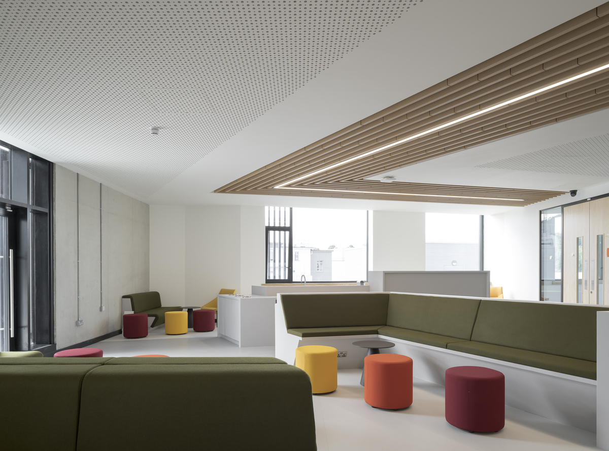 Designed by McCauley Daye O'Connell Architects and constructed by Felix O'Hare & Co. Ltd, alongside installer Ard Contracts, the three-storey building has two interlocking blocks for student, academic and administration functions with a communal atrium linking both. Ecophon Solo™ Baffle in colour Wet Sand has been used as a coherent design feature running through all parts of the building.