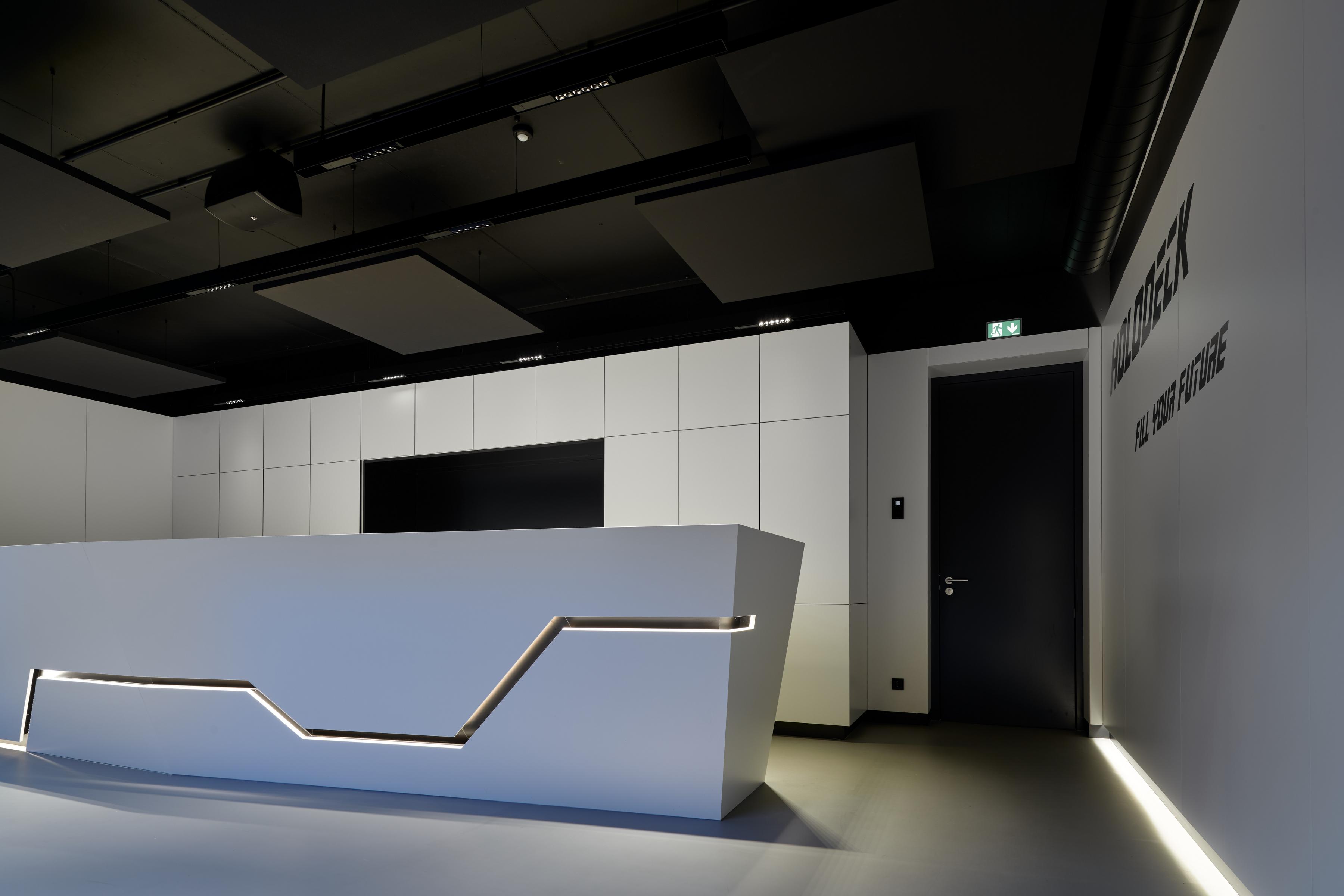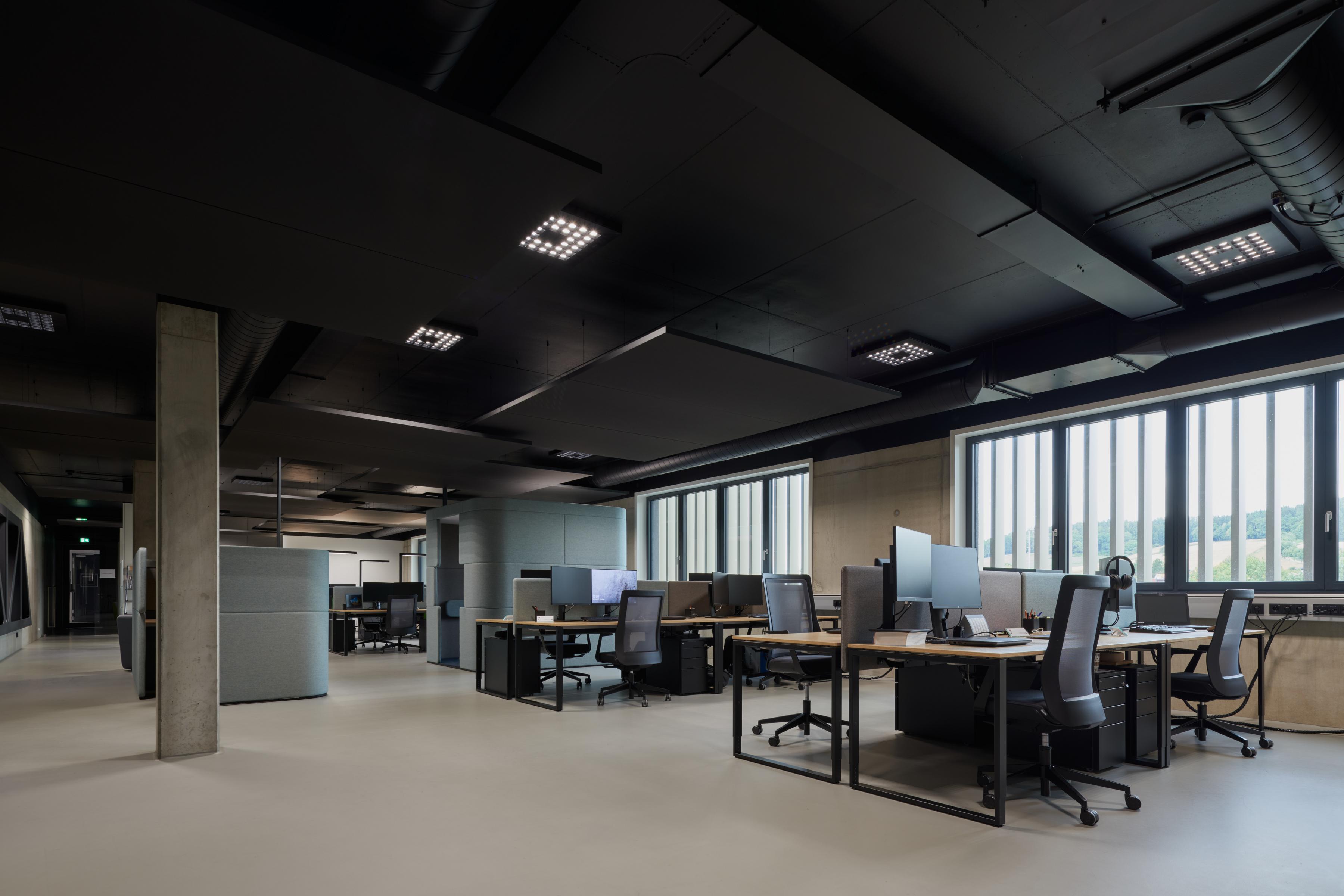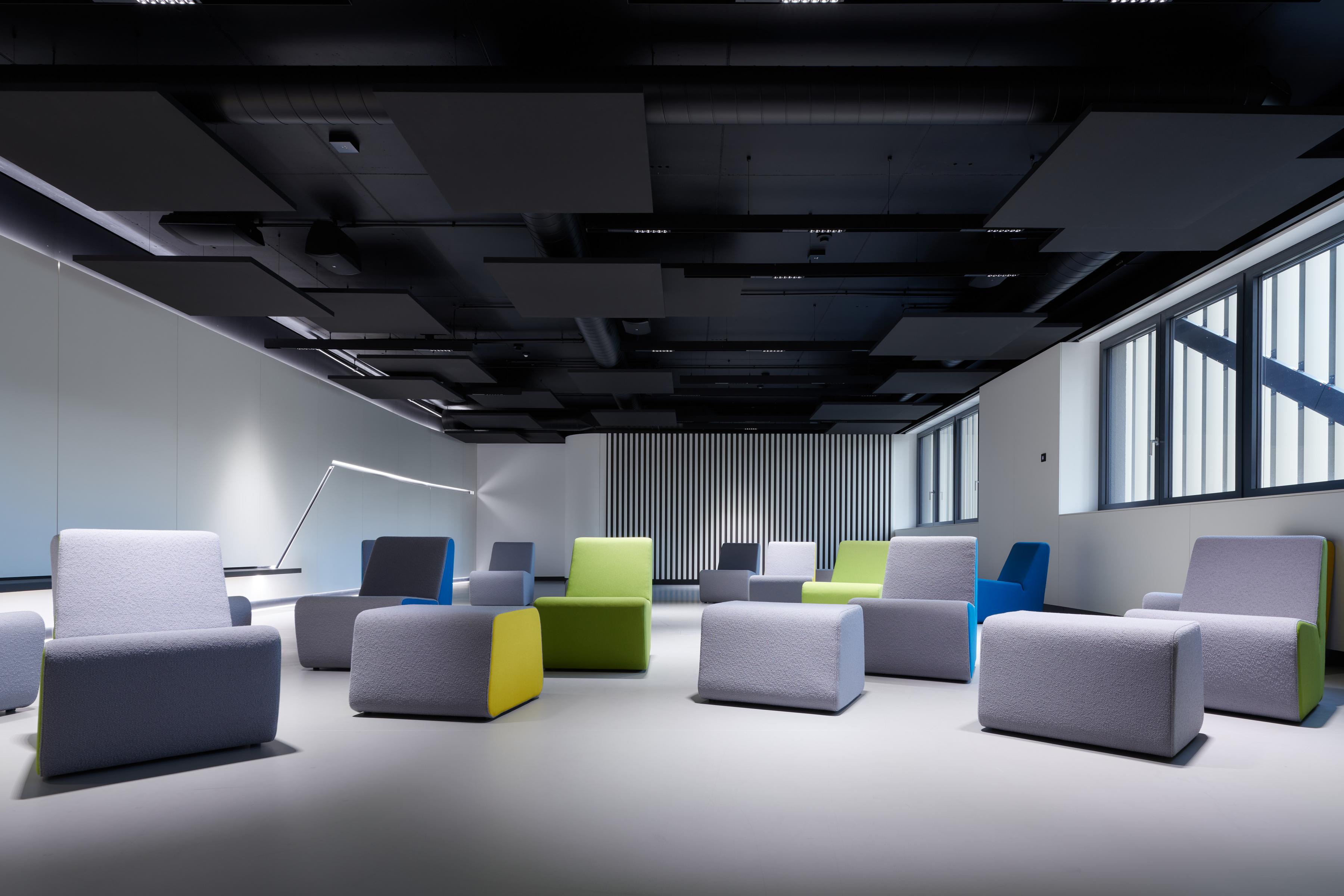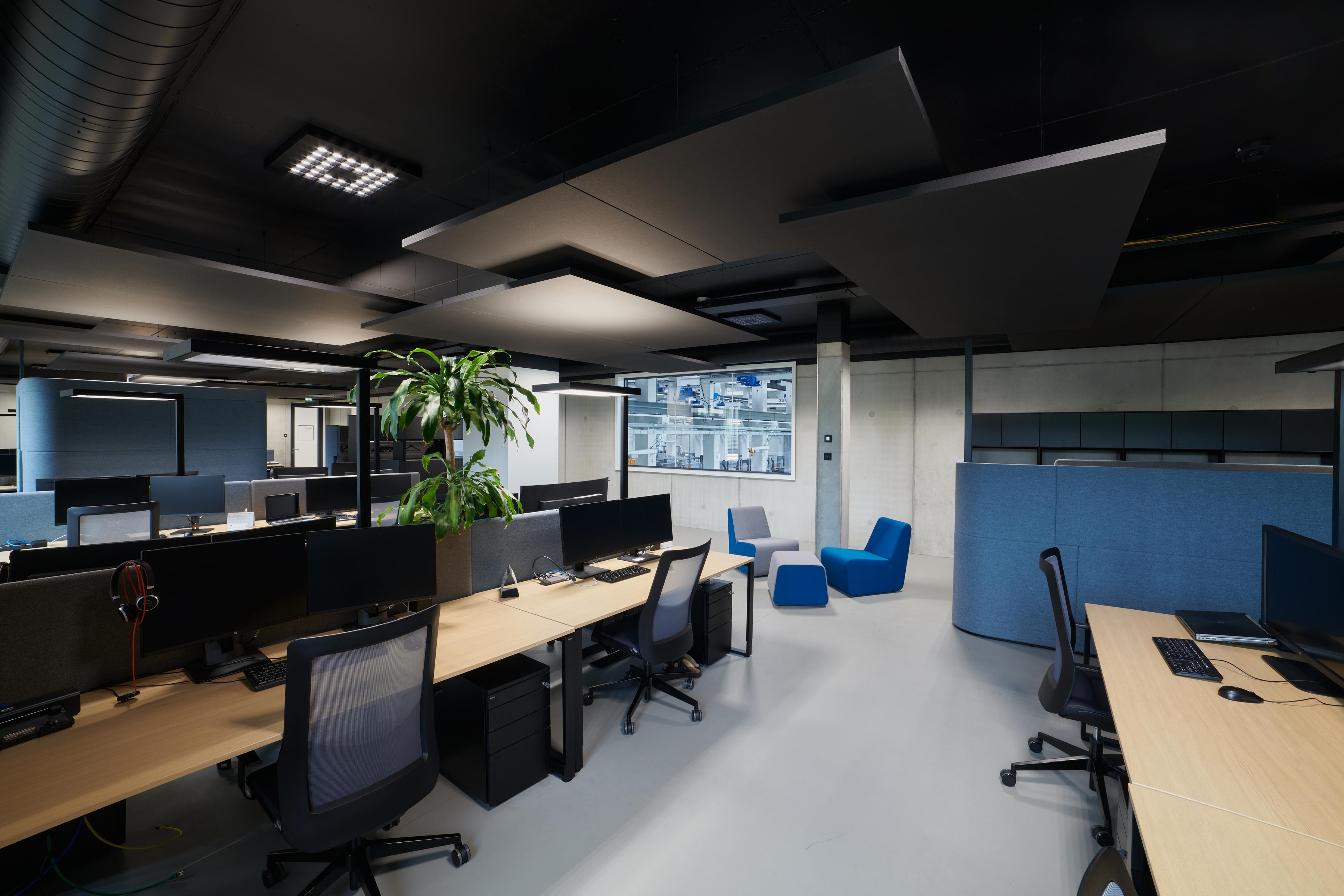 In all rooms, both the laboratories and the holodeck, as well as the open office workstations, Ecophon Solo™ Rectangle in the colour Dark Diamond was chosen. The free-hanging units fit well into the futuristic, minimalist design concept and provide a pleasant acoustic atmosphere.