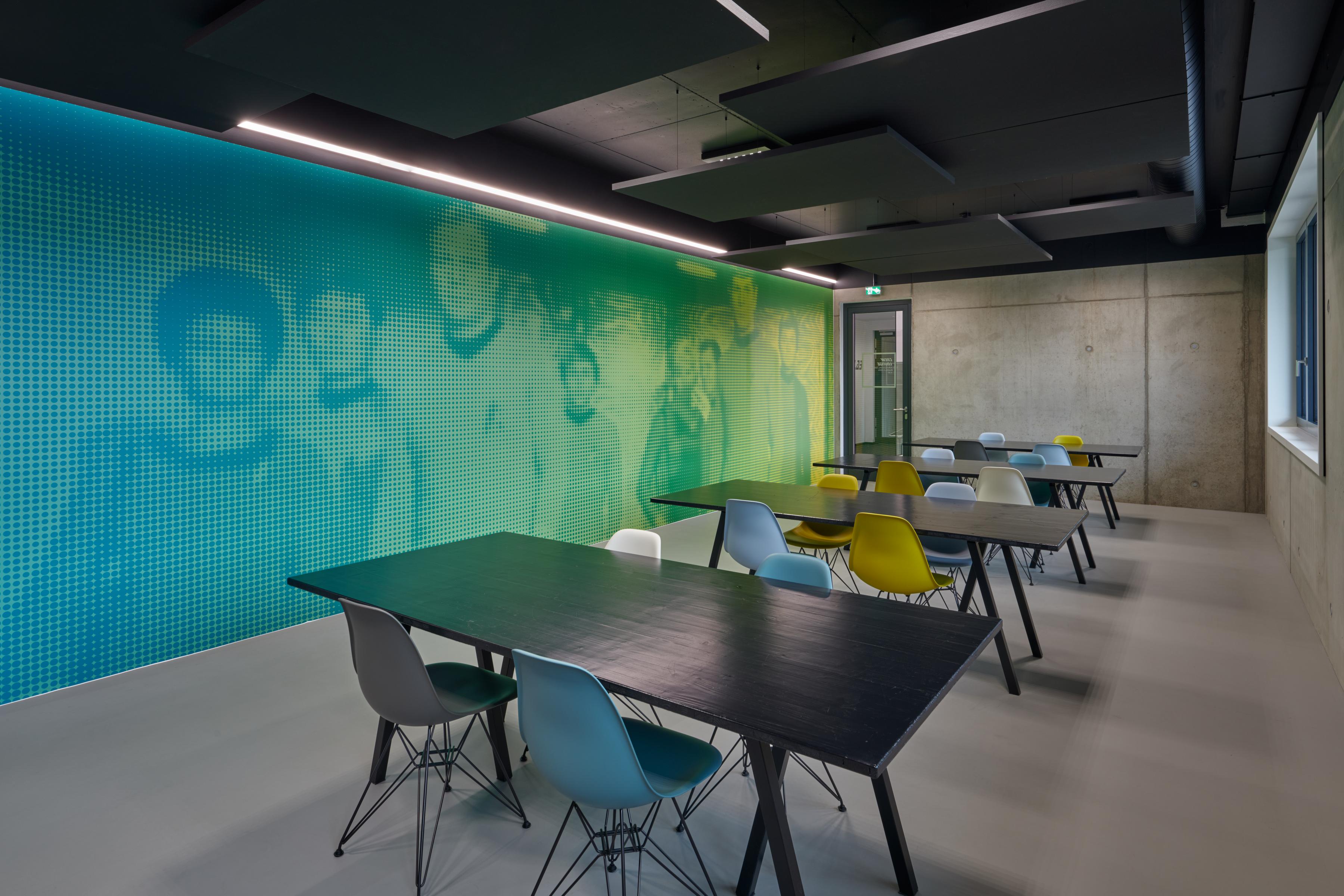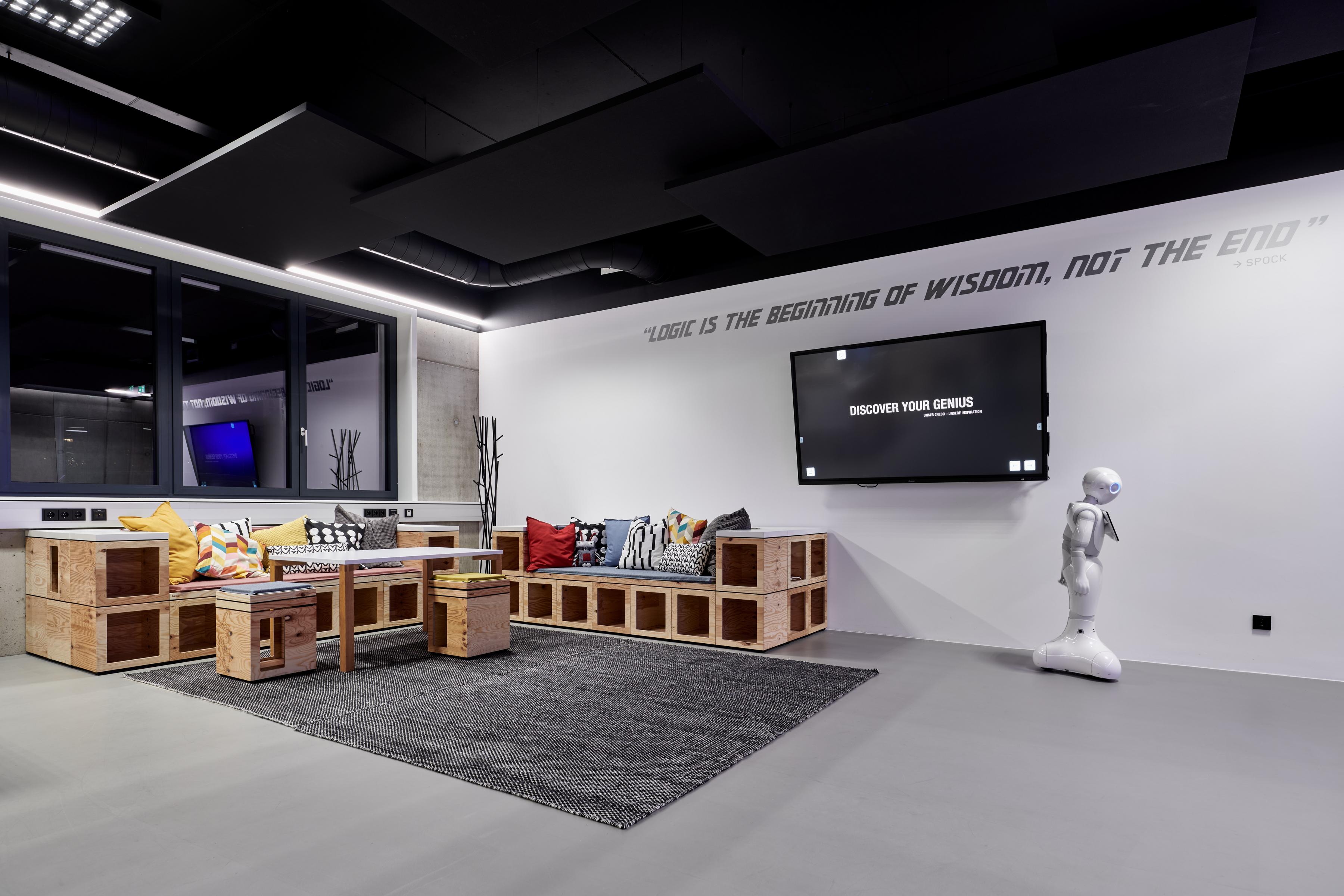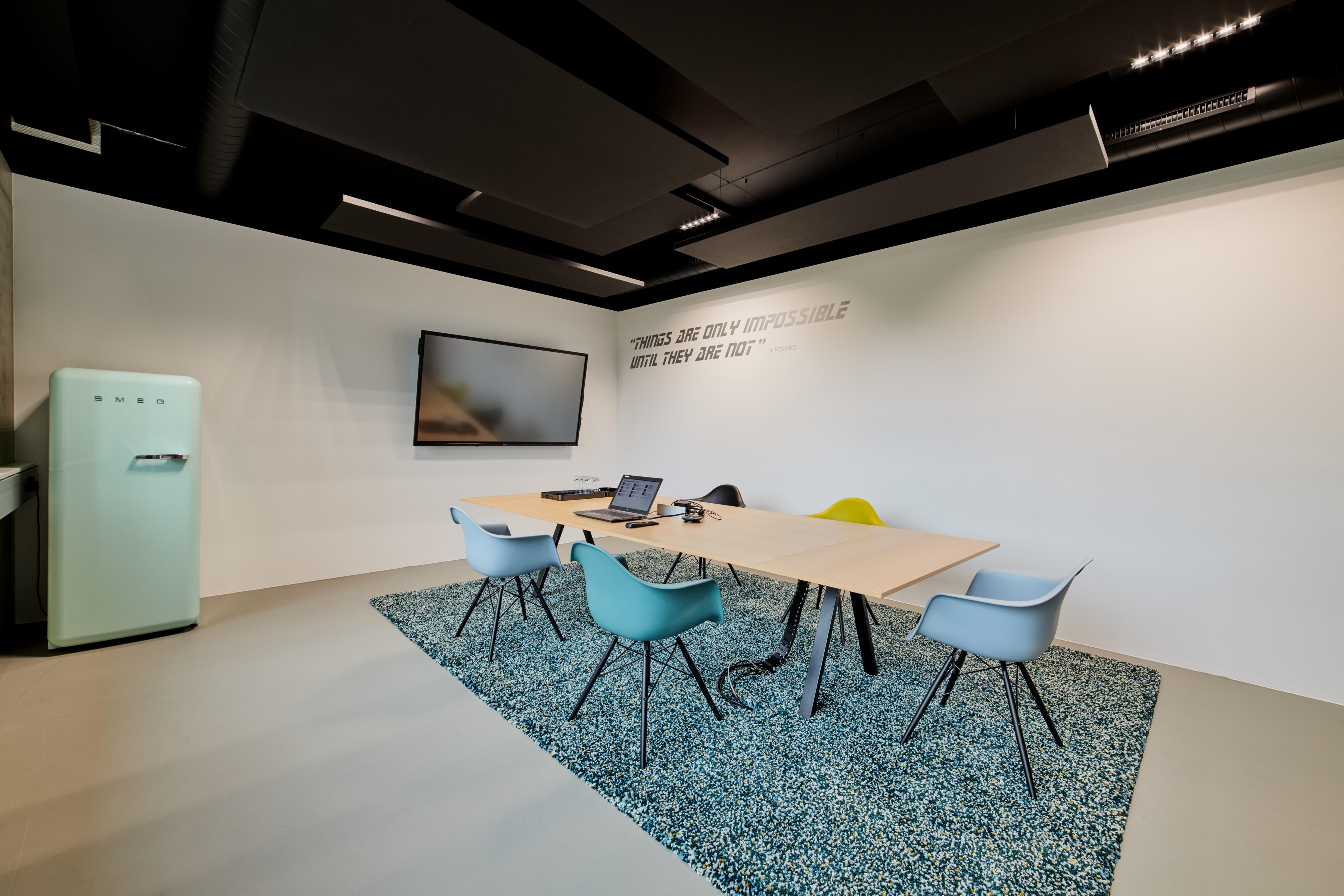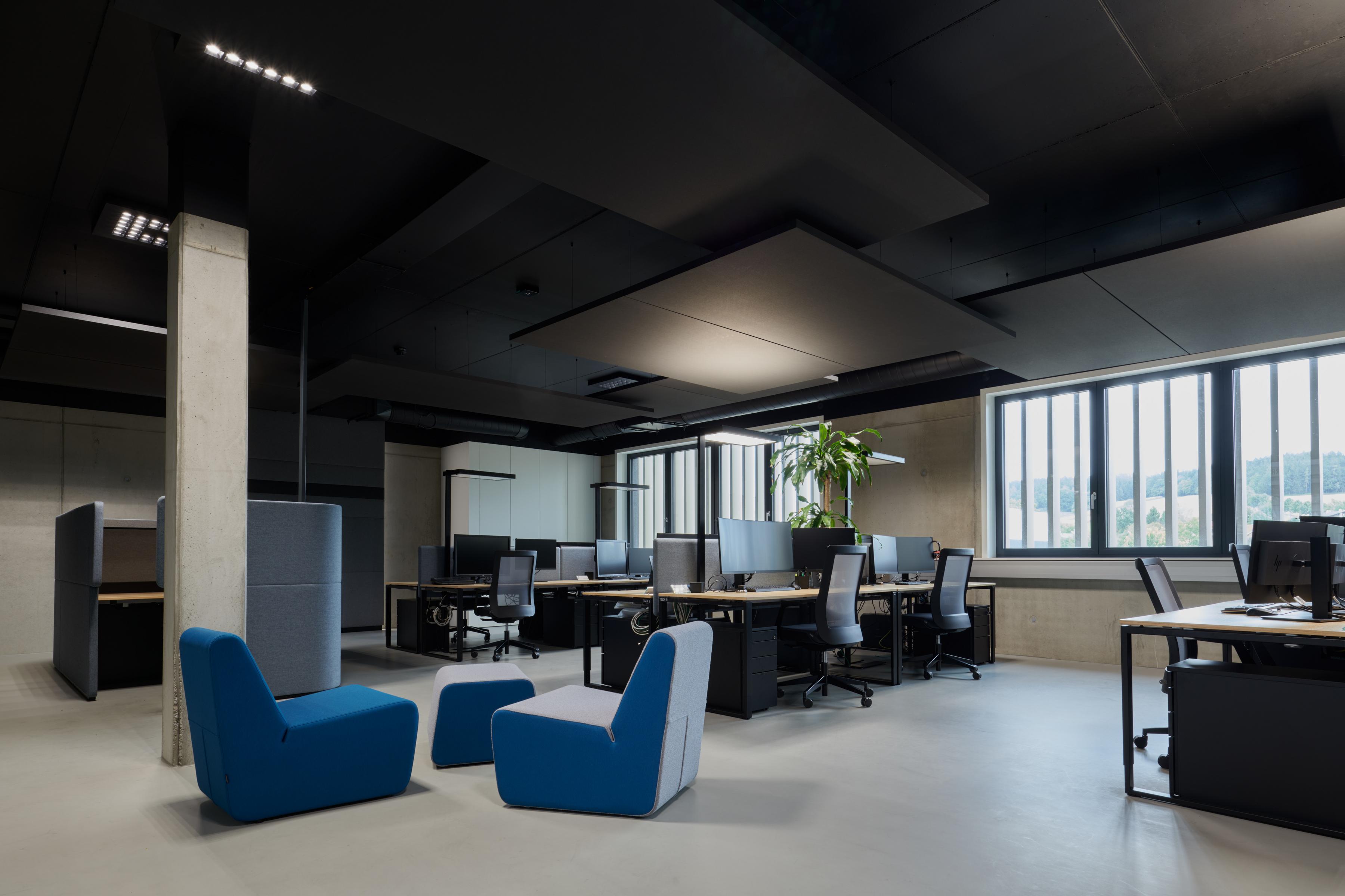 In all rooms, both the laboratories and the holodeck, as well as the open office workstations, Ecophon Solo™ Rectangle in the colour Dark Diamond was chosen. The free-hanging units fit well into the futuristic, minimalist design concept and provide a pleasant acoustic atmosphere.