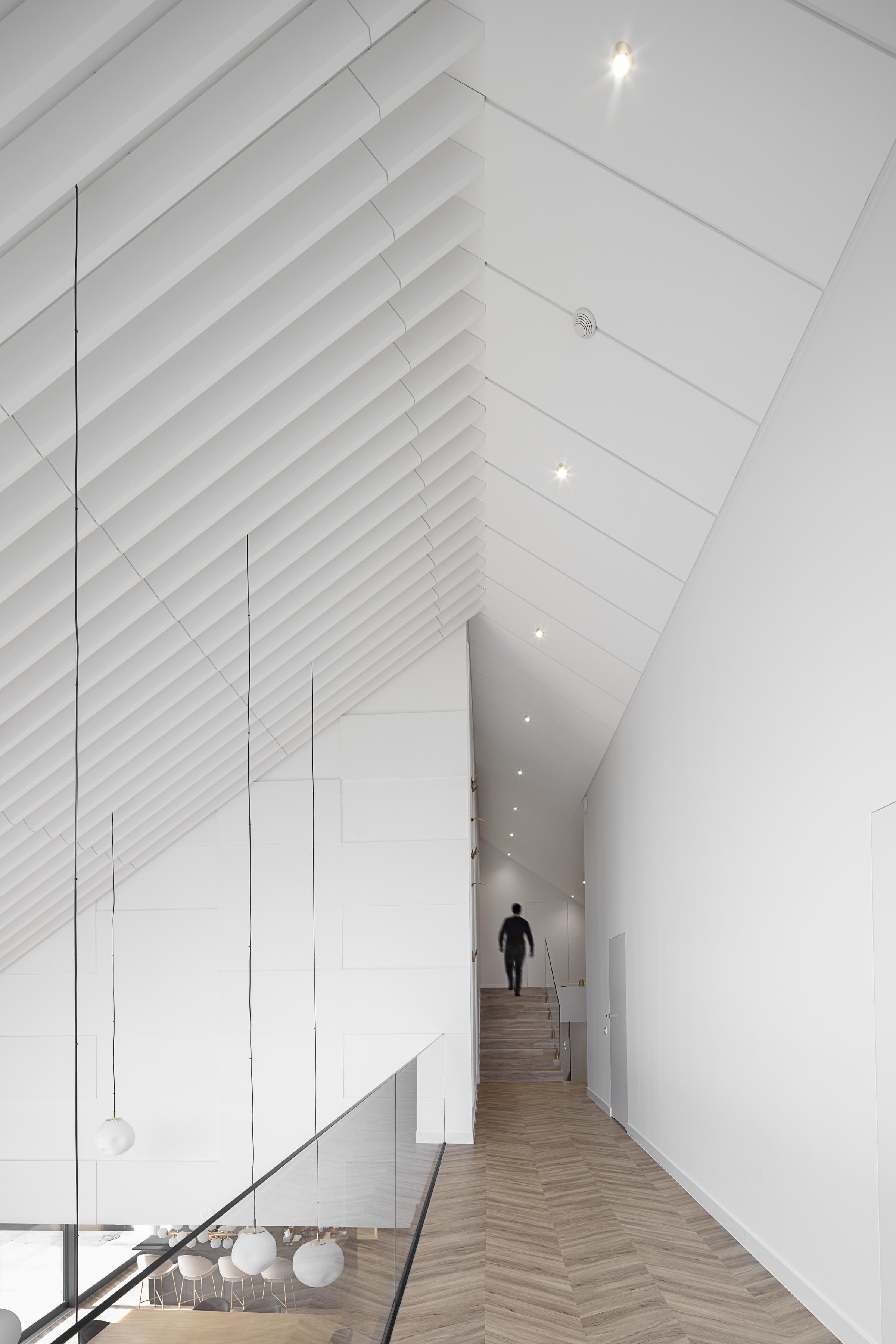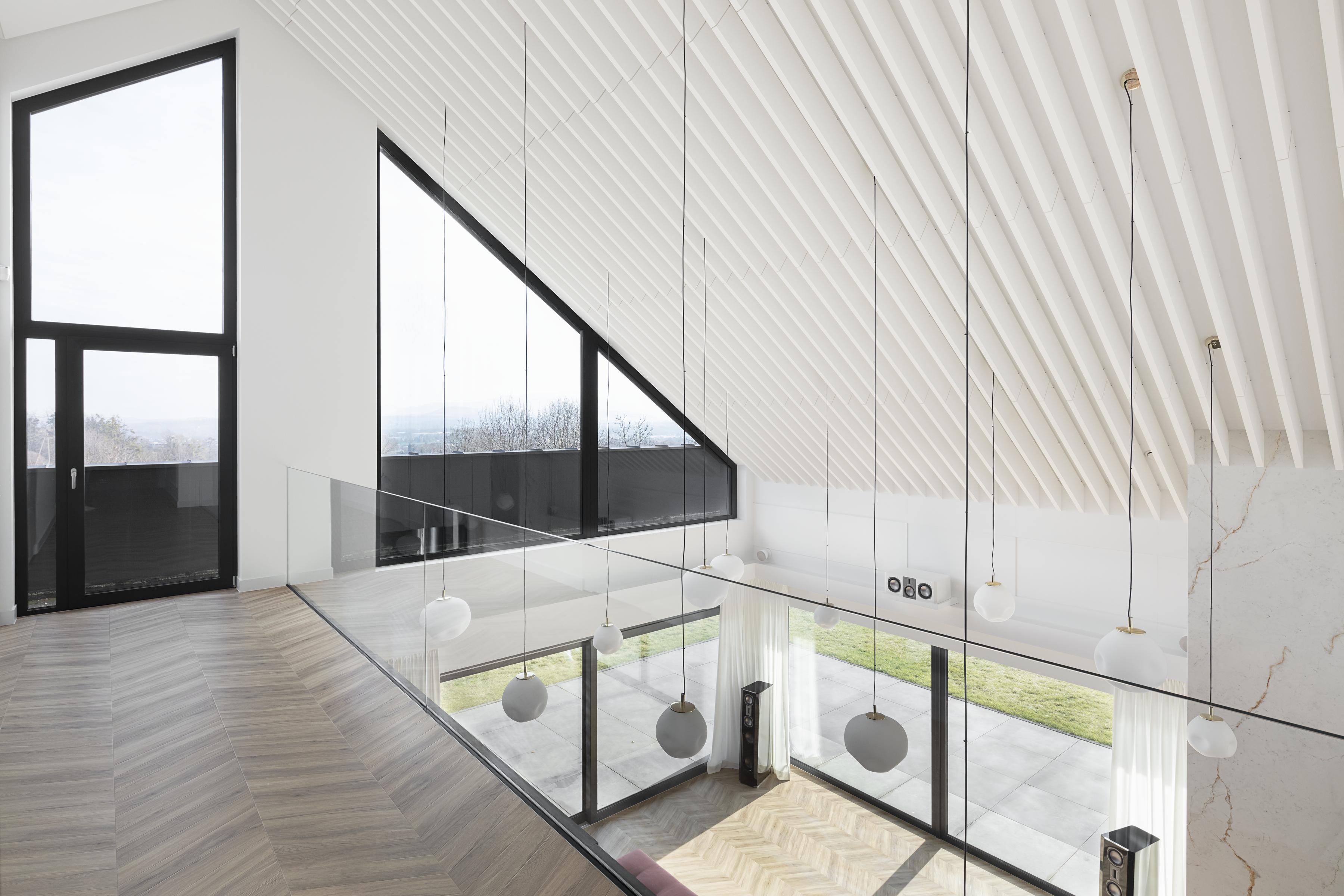 It was also important that the sounds from the living room did not spread throughout the house. Speech intelligibility in such a large open space was also significant. The design of the house was made by Michał Kościelny from the Lobo architectural studio and the Kowalczyk couple. The concept assumed the use of the highest quality materials. For the acoustic arrangement of the house, 168 pieces of free-hanging vertical Ecophon Solo™ Baffle ceiling tiles were used, which perfectly match the atmosphere of the interior, also ensuring the appropriate soundproofing. The Ecophon Focus™ Lp ceiling system in the corridor made it possible to reduce the high reverberation characteristic of such a building shape. Ecophon Focus™ Levels of different thicknesses were installed on the walls to reduce horizontal reflections.