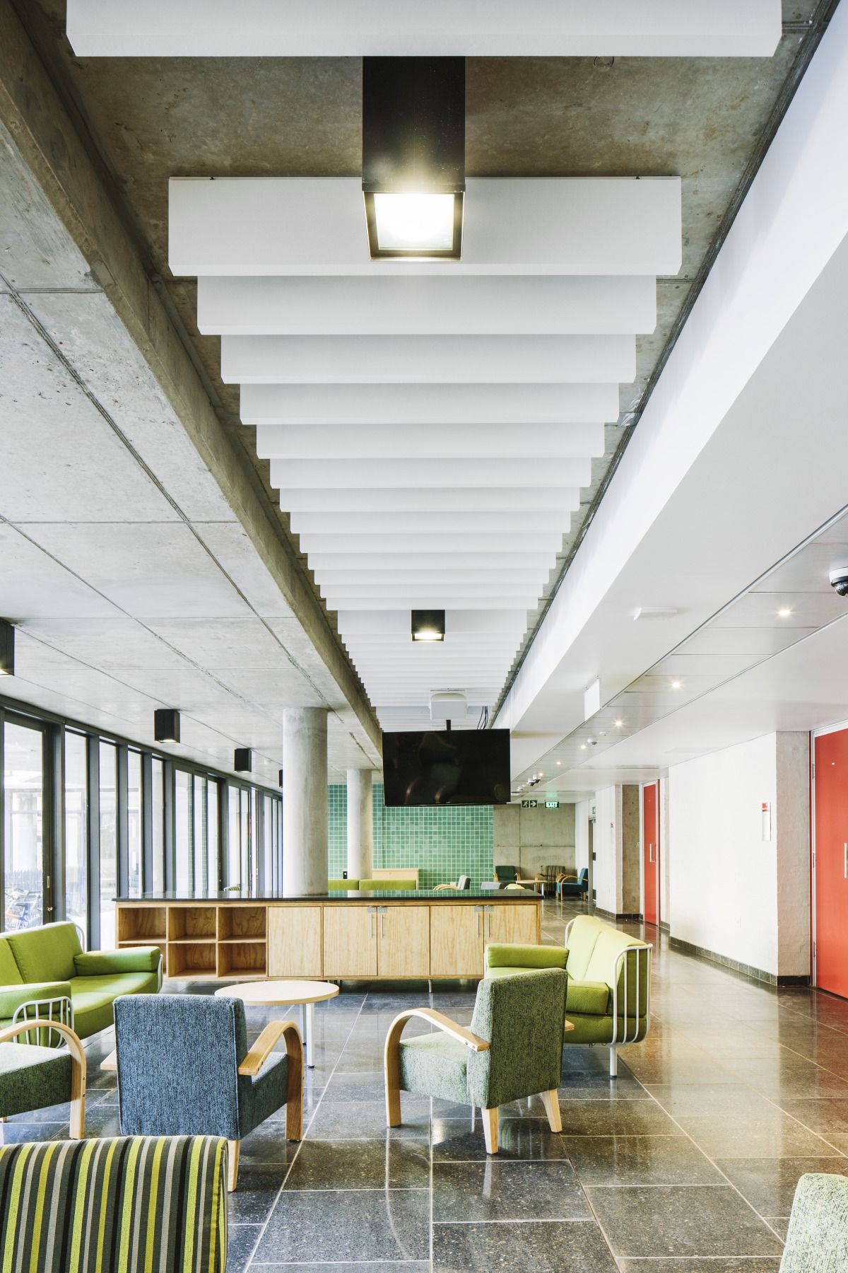 Sol Plaatjie is a new state university in the Northern Cape province. The university building utilizes TABS thermally activated building system) technology. The architects and project team have created a modern and inspiring campus that meets the challenges and demands that are placed on a learning environment. To create acoustically good conditions a selection of free hanging units and wall panels was installed.