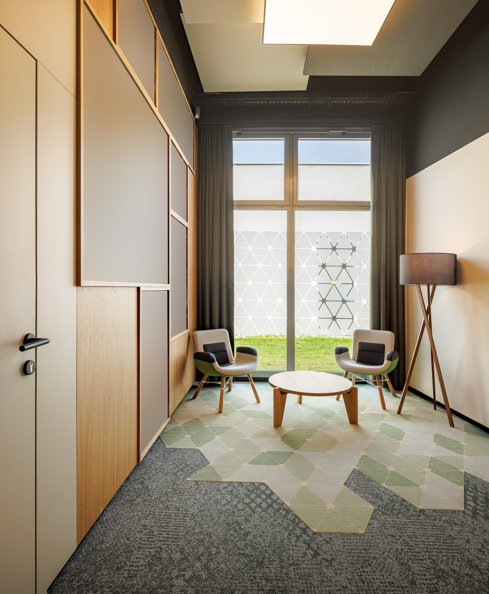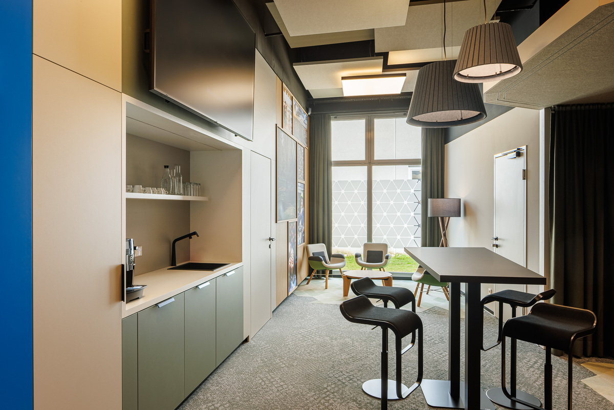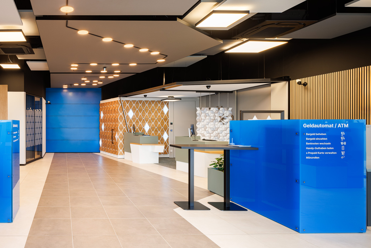 The Mühlbach Ost branch of Sparkasse NÖ Mitte West AG sets a bold example for the bank’s new interior concept, centered around the striking “CashCube” – a modular, room-in-room consultation space.