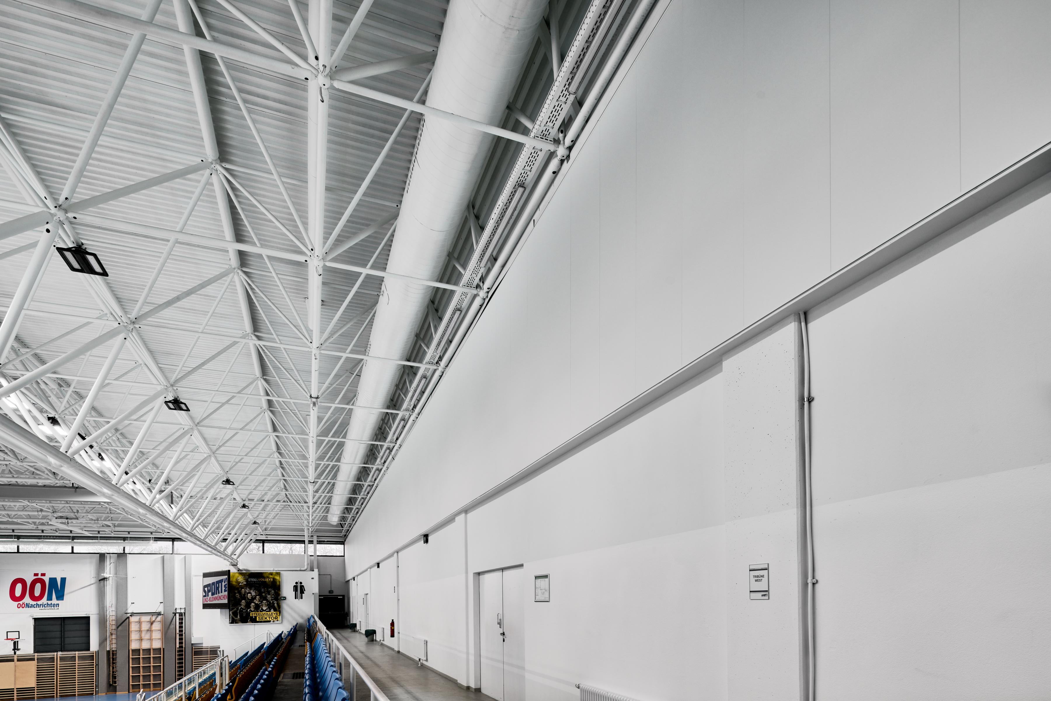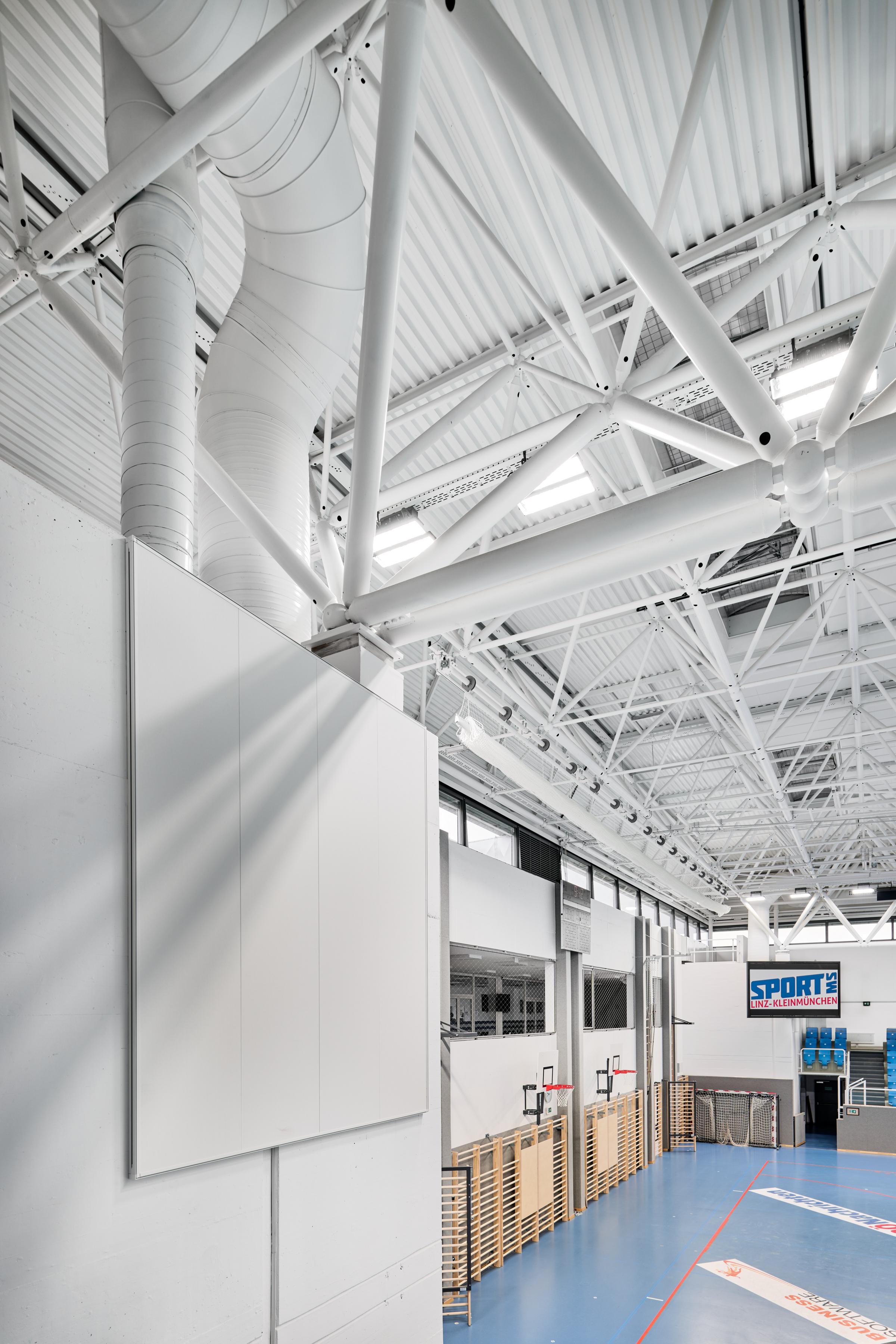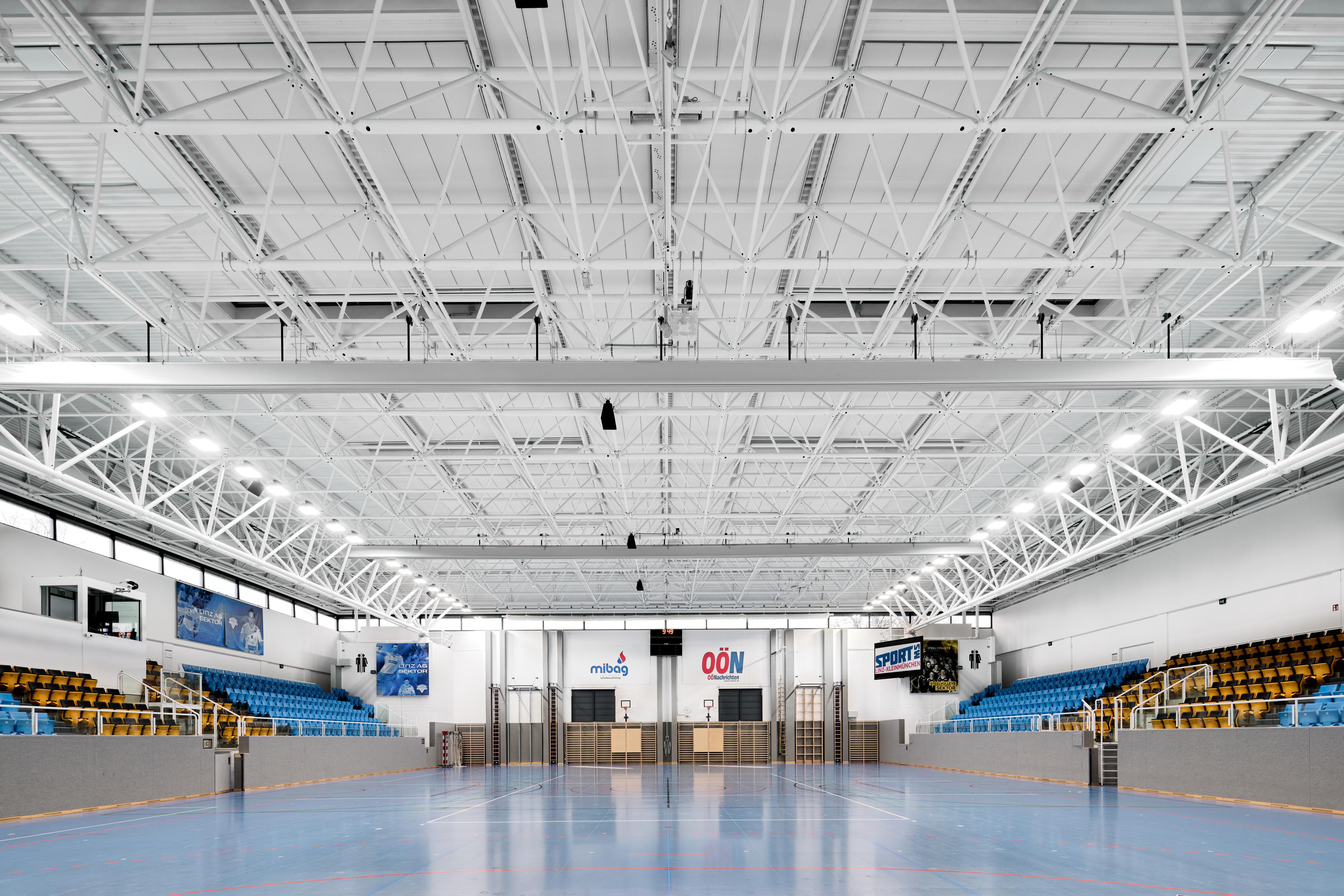 The sports hall of the sports school in Kleinmünchen, Austria has been extensively renovated. To make the sports hall suitable for handball and volleyball sports in the Austrian national league, the existing hall roof was raised to 9 meters.