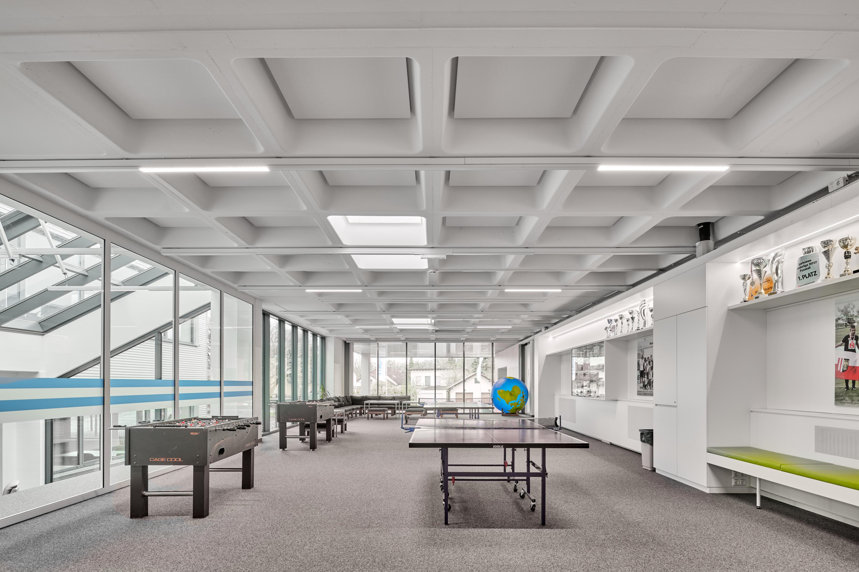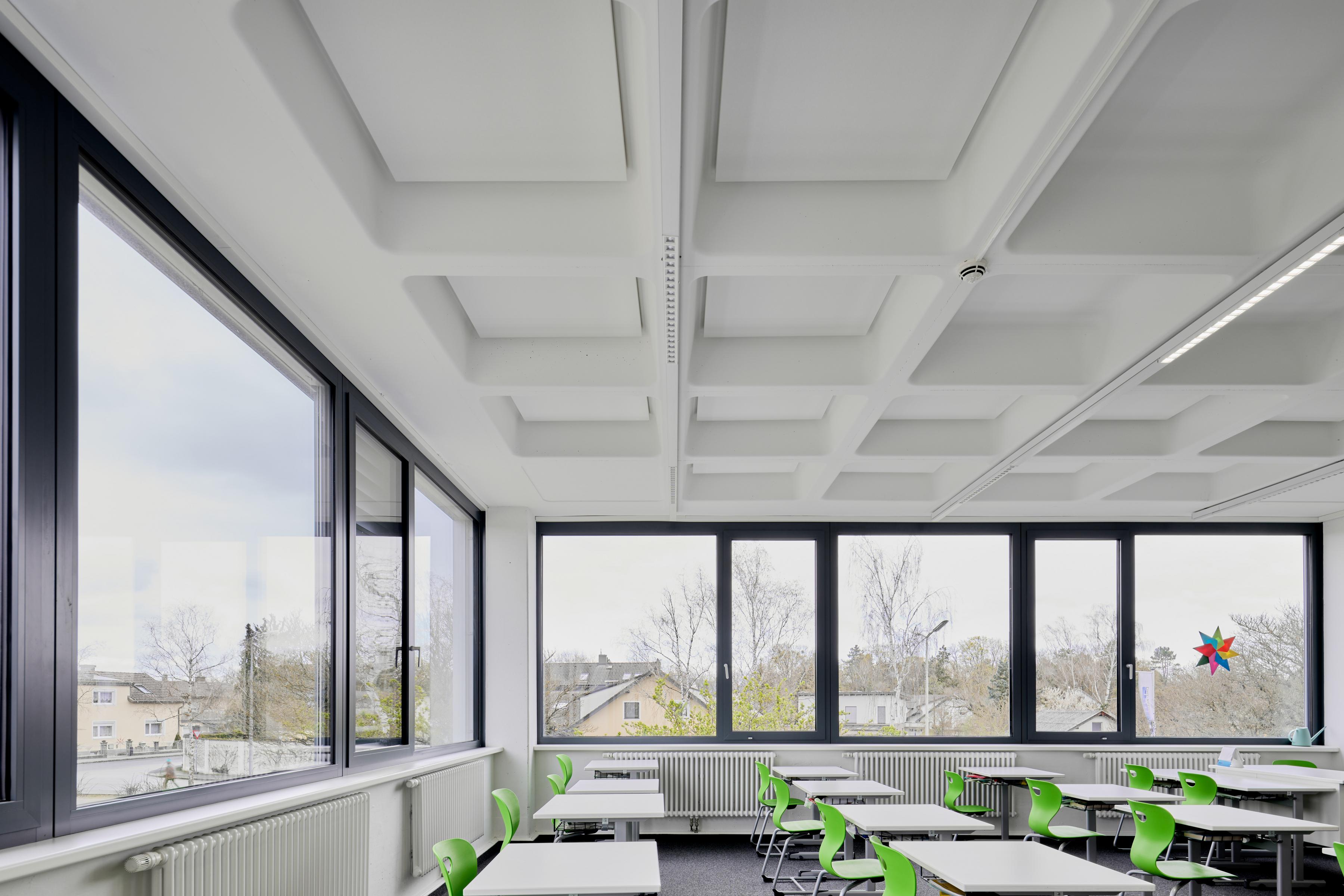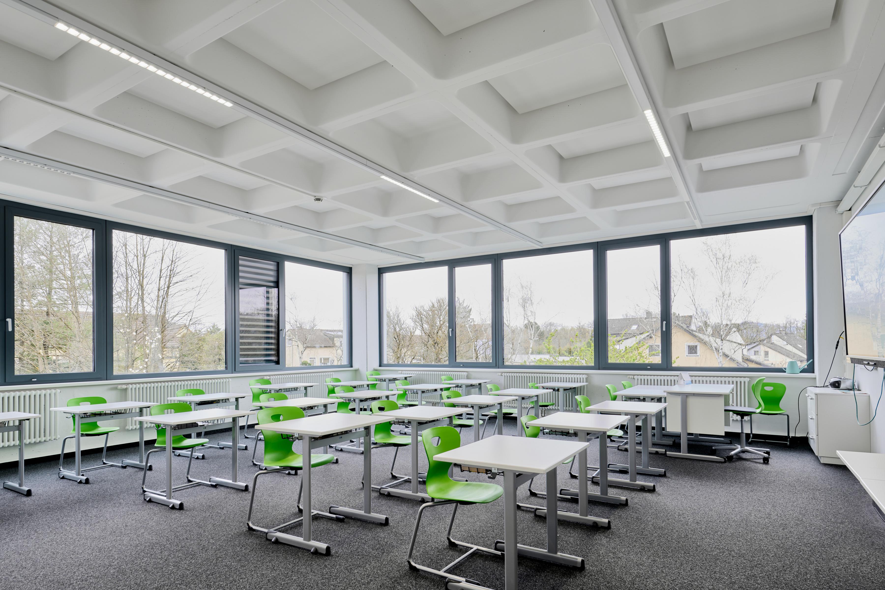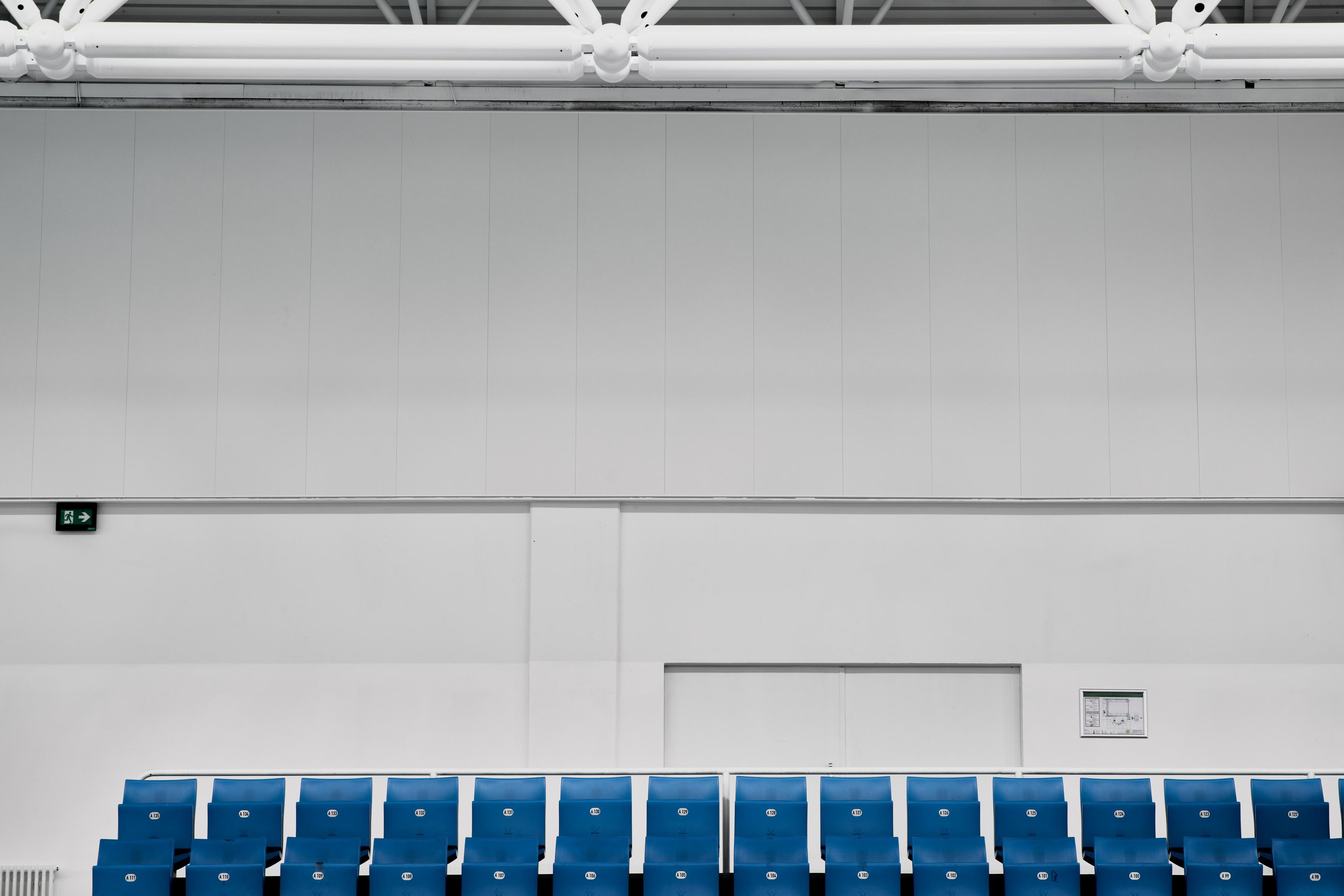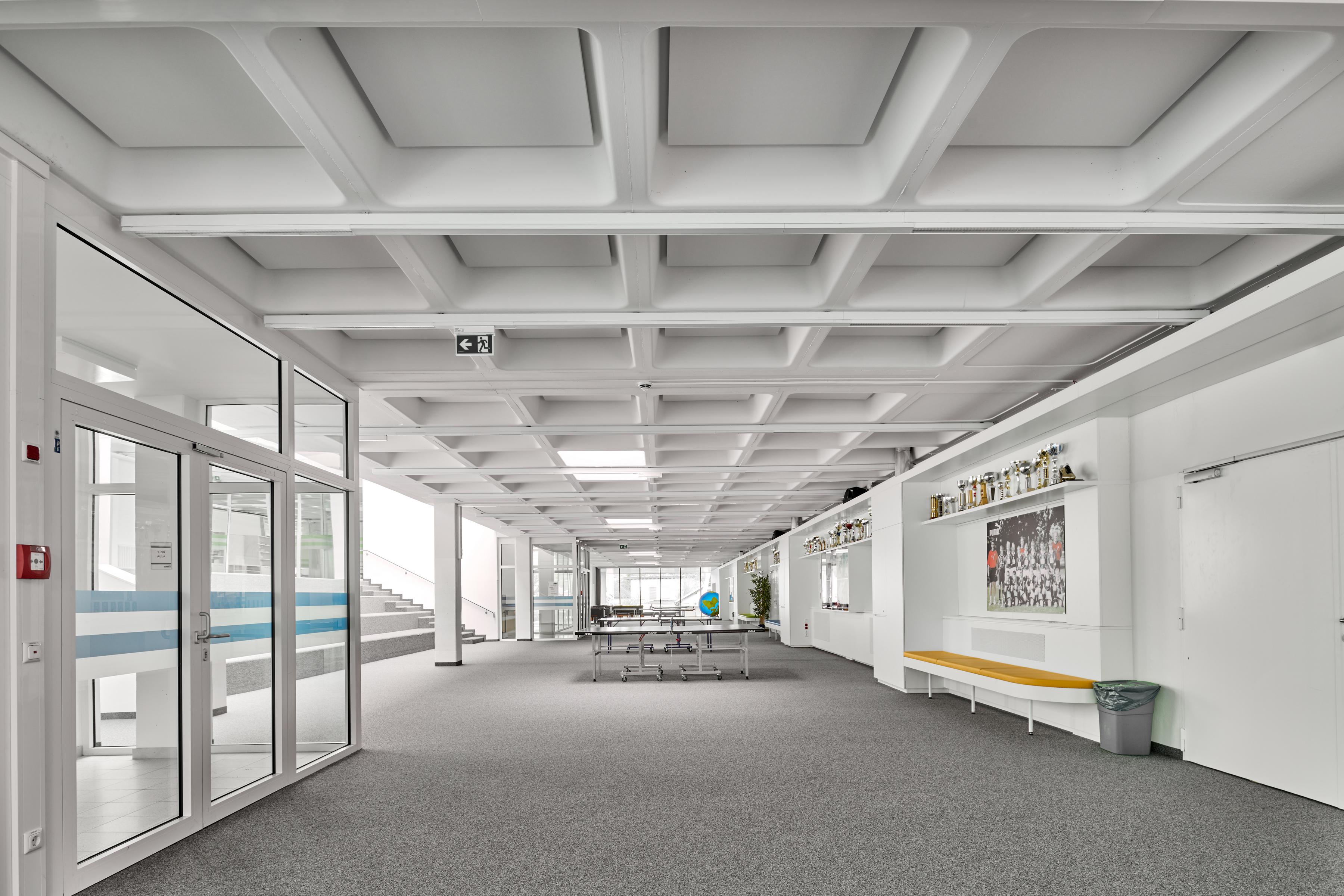 For both educational purposes and large sporting events, it is important that the hall's acoustics perform well. The mechanical impact-resistant acoustic ceiling Ecophon Super G™ Plus A with its robust grid system is ideally suited for the use in sports halls, which is why it was installed on the entire ceiling in this case. Ecophon Akusto™ wall panels with the reinforced Super G surface are installed on the walls behind the stands.