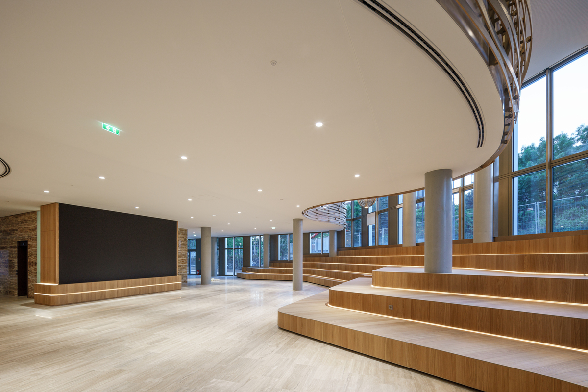 Acoustics played a central role in the design of the REIWA project, particularly in the reception hall. This large-volume space serves multiple functions, including welcoming visitors, distributing to various landings, and providing catering and work areas.