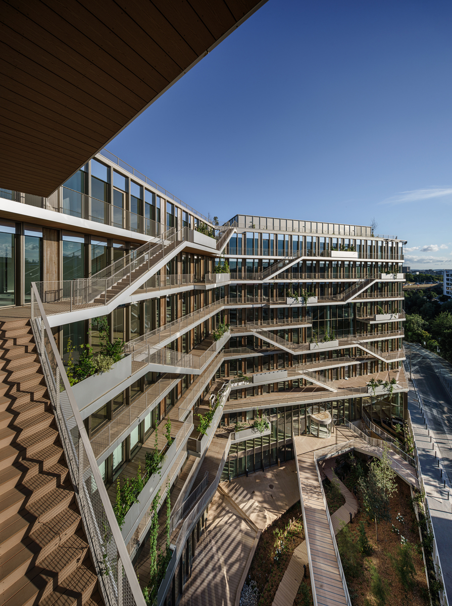 The REIWA building, Nexity's new headquarters, spans 25,000 m2 and is located in the northern suburbs of Paris. Its distinctive "S" shape integrates gardens, terraces, walkways, and green roofs, creating innovative workspaces. The building features a crystalline facade and a warmer wooden facade at garden levels, reflecting Nexity's commercial and residential focus. It meets strict environmental criteria, earning several sustainability certifications.