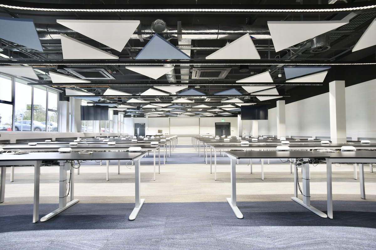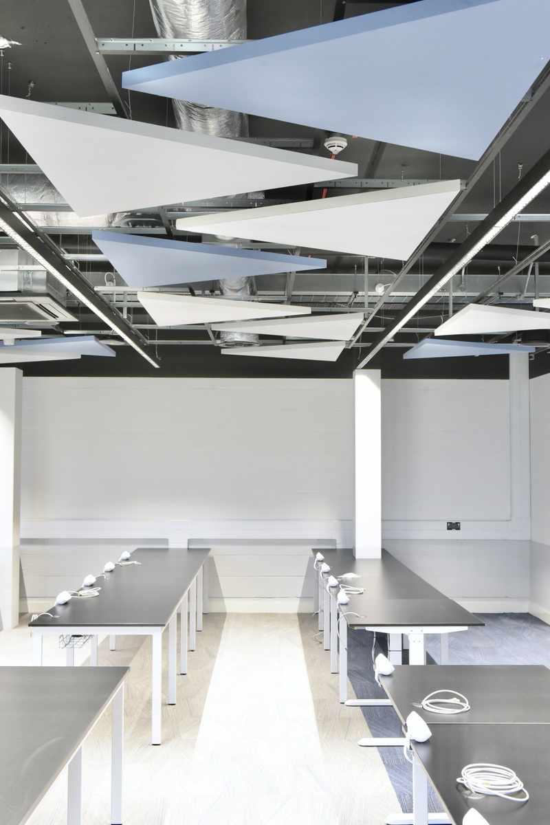 McAdam Design has previously integrated Ecophon Solo™ Triangle solutions into projects at Ulster University’s Games Design and Development Suite. To ensure consistency across the campus, we collaborated extensively with the main contractor, Bell Contracts, and the installer, ROC’S Contracts. Our objective was to install the Solo Triangle panels around the mechanical and electrical elements at a uniform height, maintaining alignment with the lighting fixtures and achieving a precise fit.